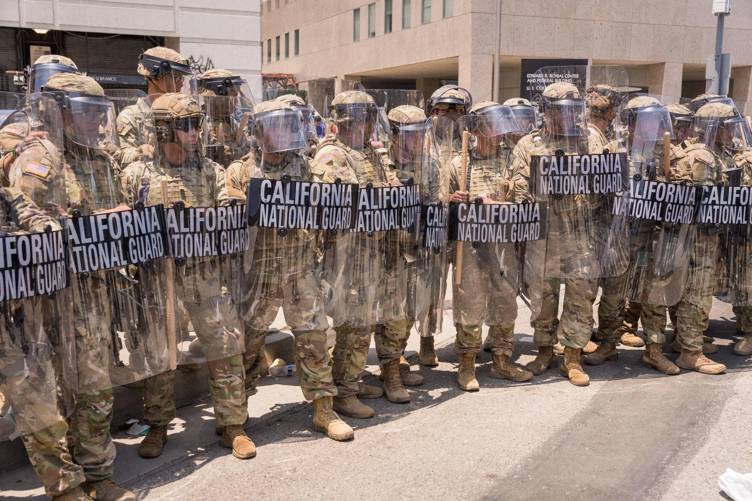 National Guard members at the Metro Detention Center in Downtown Los Angeles on June 8th, 2025, amid protests against federal immigration raids, June 8, 2025. Jim Newberry / Alamy.