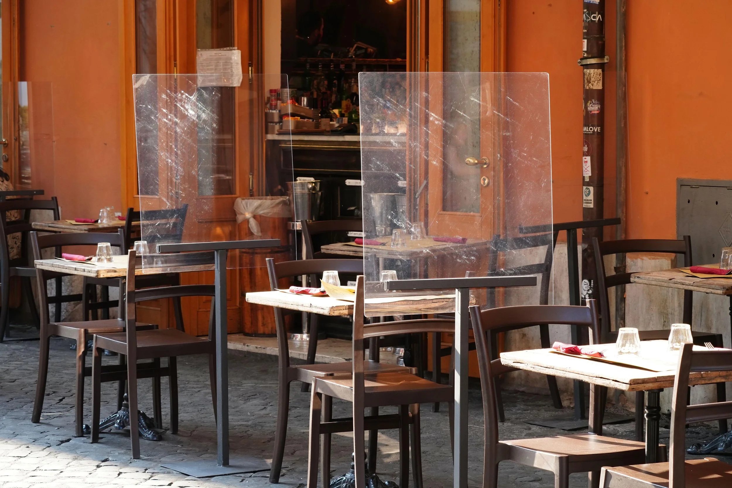 Plexiglass screens on metal stands for social distancing in Trastevere, Rome, Italy, September 12, 2020. Daniele Cossu / Alamy.