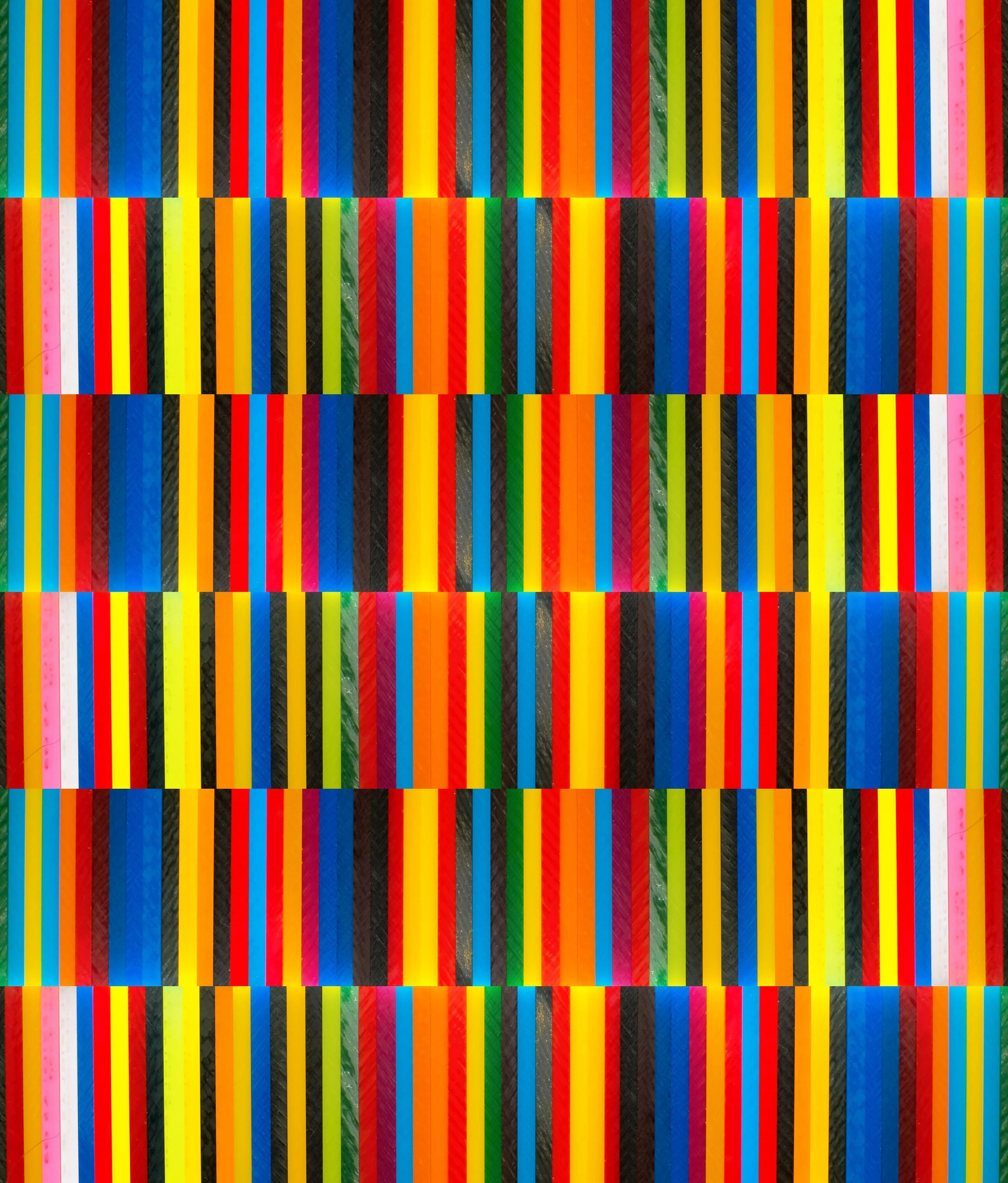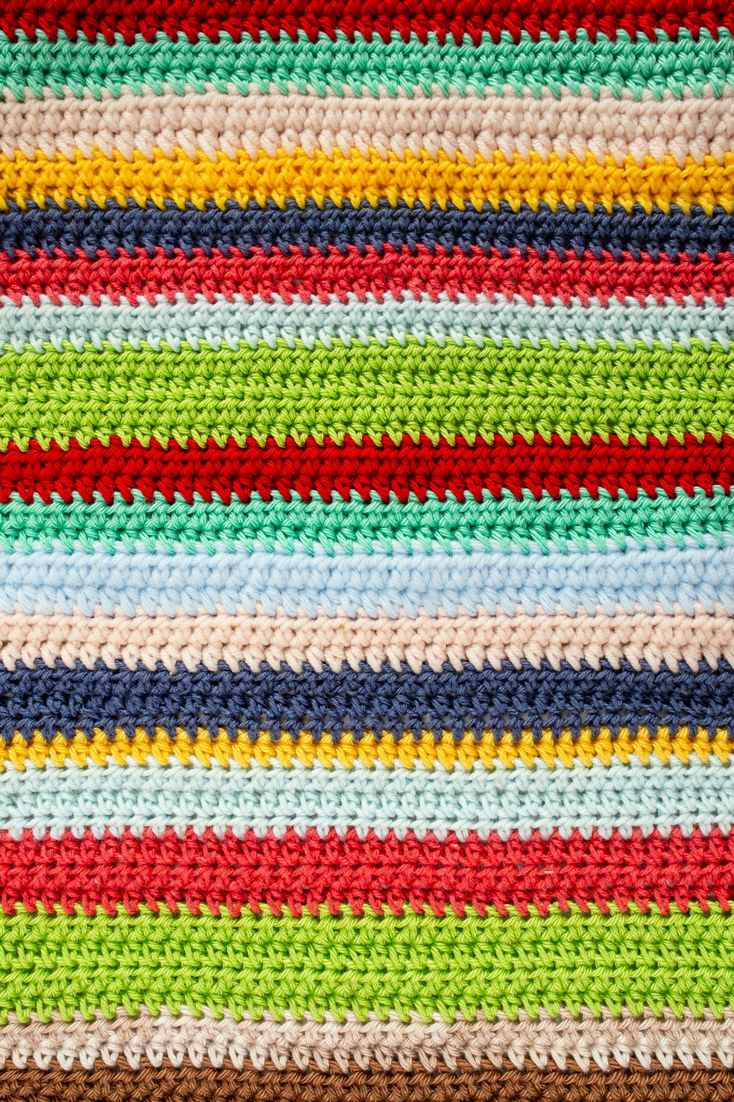 Red, green, blue, beige, aqua, brown, yellow and navy rows of a horizontal multi-colored crochet lines pattern, June 11, 2023. Dorin Puha / Alamy.