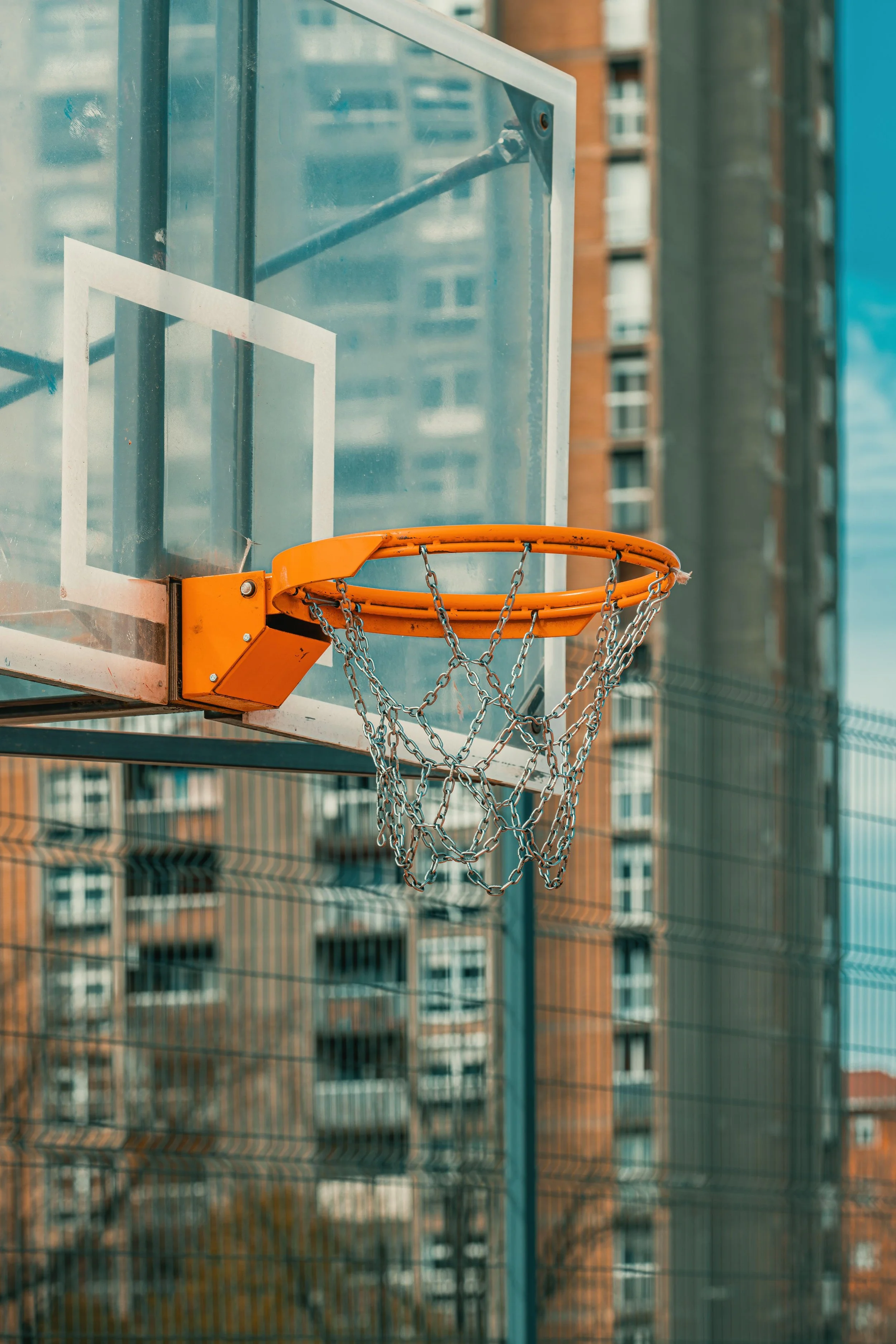 Outdoor basketball backboard and hoop rim with chain net in urban residential district, Serbia, 2023. Igor Stevanovic / Alamy.