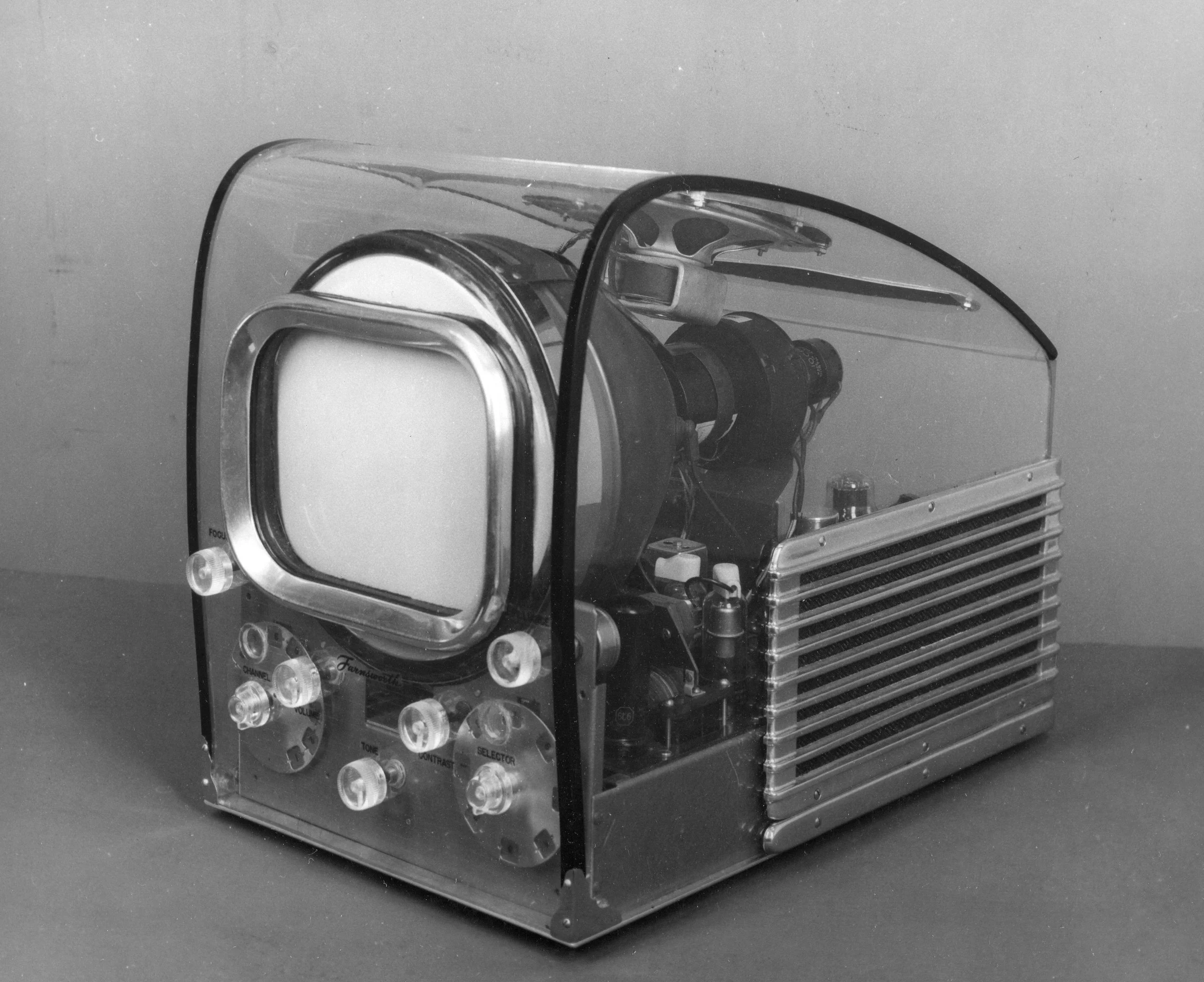 A Farnsworth table model television receiver installed in a Lucite cabinet to show the operation of the components, 1949. rbm Vintage Images / Alamy.