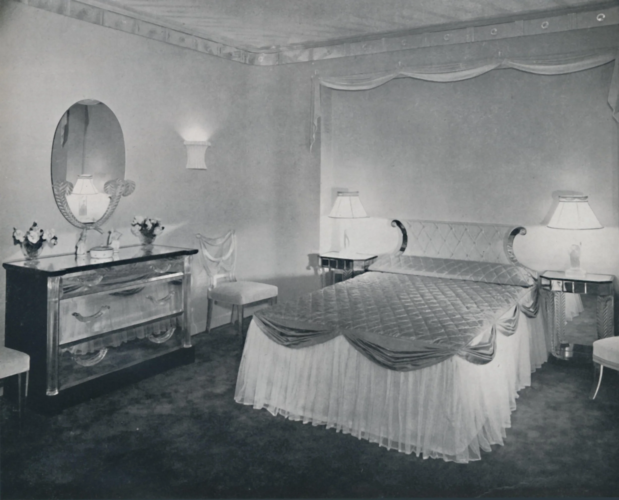 Grosfeld House Plexiglas bedroom, 1942. From Decorative Art 1942 – The Studio Year Book, edited by C. G. Holme. [The Studio Ltd., London, 1942]. The Print Collector / Heritage Images / Alamy.