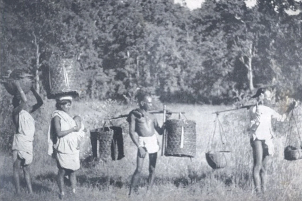 Elwin, Verrier. 1942. The Agaria. [London]: H. Milford, Oxford University Press, "Party of Agaria from Bhoira, Mandla District, returning from the jungle with ore and charcoal," Plate 21.