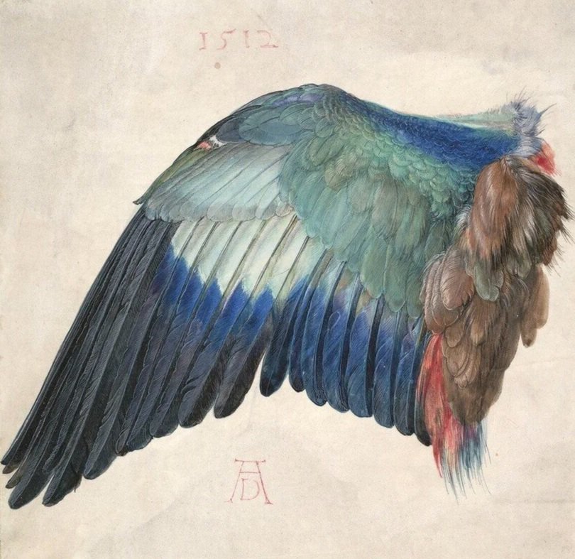 Albrecht Dürer (German, 1471–1528), Left Wing of a Blue Roller, ca. 1500 or 1512. Watercolor and gouache on vellum, heightened with white. 7 3/4" x 7 7/8". (Albertina, Vienna).