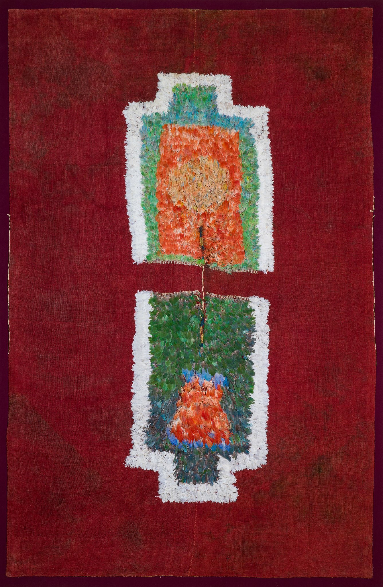 Nazca Culture, Complete Feather Tunic, ca. 600 AD. Camelid fibres with applied feathers. 65 7/8" x 43 5/16". (naz0003). Paul Hughes Fine Arts.