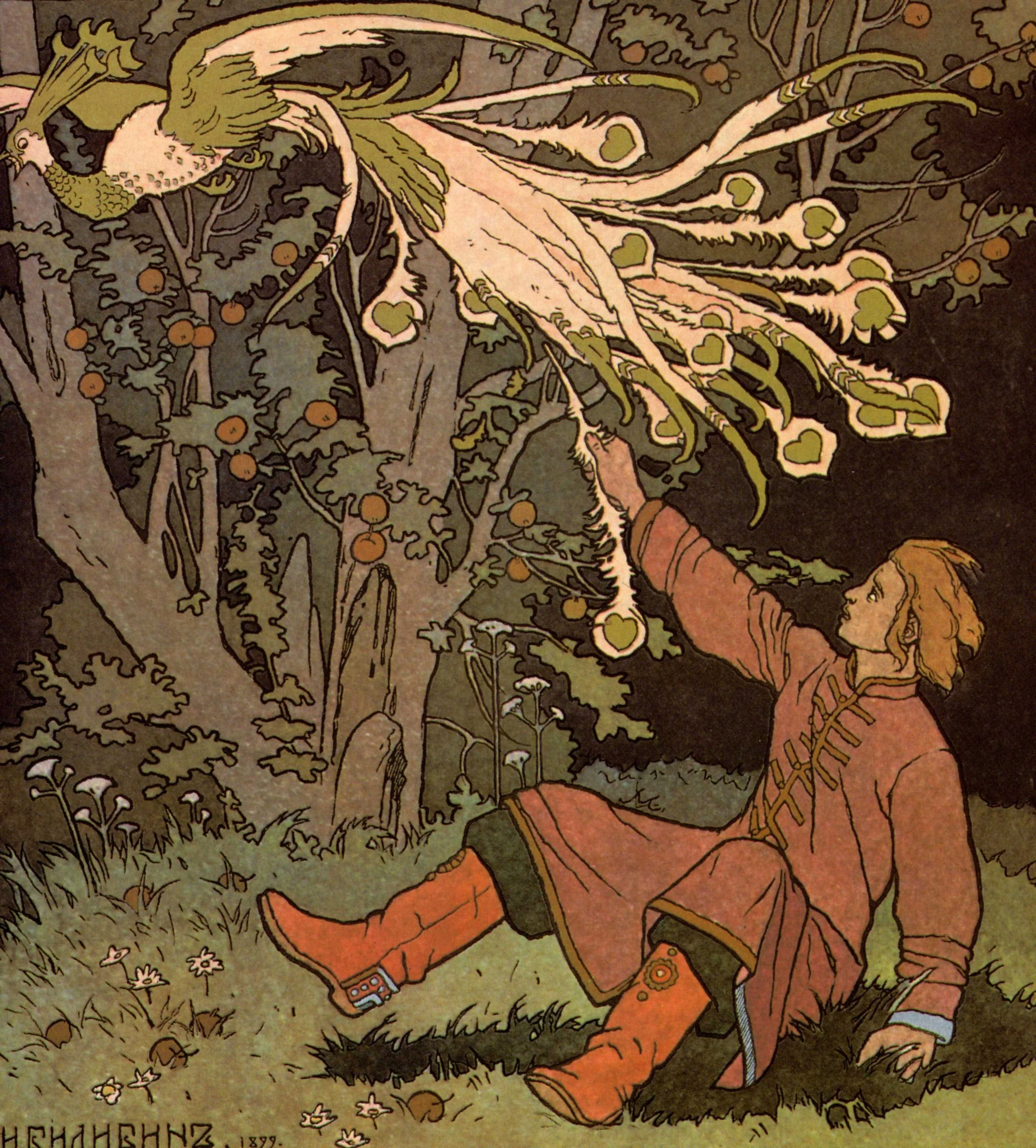 Ivan Yakovlevich Bilibin, “Prince Ivan and the Firebird,” illustration for Russian Fairy Story, The Firebird, published in Saint Petersburg, 1901. Faithful photographic reproduction of color lithograph {{pd-Art}}.