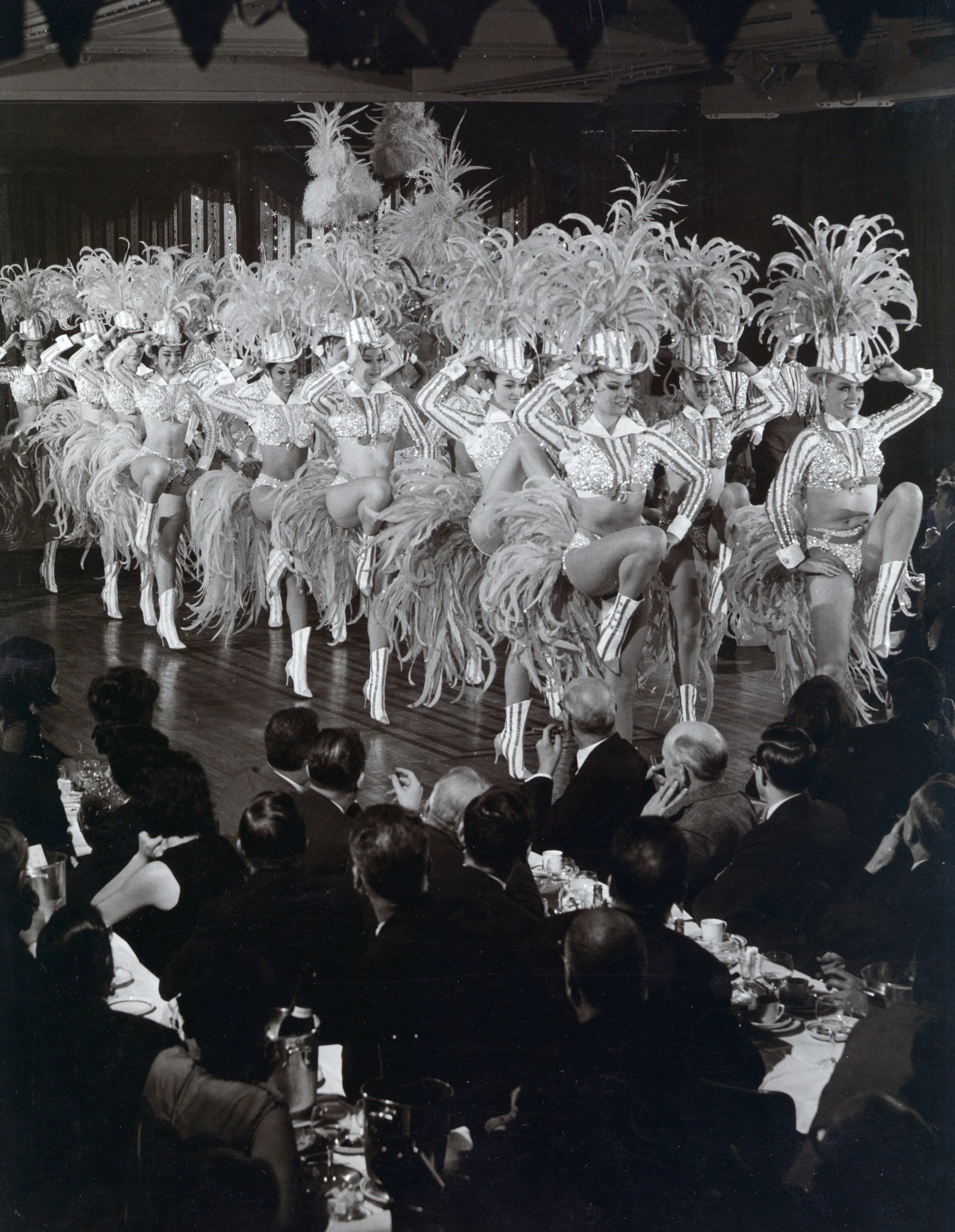 Donn Arden, Photograph of dancers marching in striped costumes with top hats, Paris, France, ca. 1950s. Donn Arden Papers, 1910s–1990s. ms-00425. Special Collections and Archives, University Libraries, University of Nevada, Las Vegas. Las Vegas, Nevada.