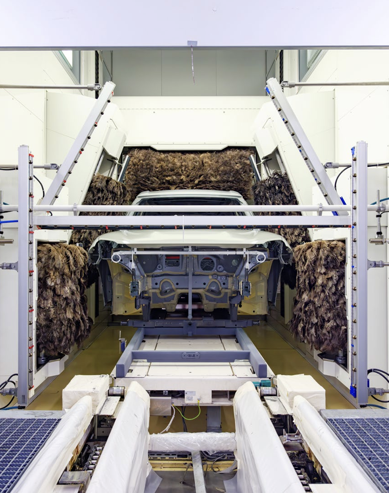 At bmw’s Leipzig factory, the mini Countryman moves through the paintshop process. Before the bodywork is painted, emu feathers are used to gently remove any remaining dust or contaminants from the surface, ensuring a flawless finish. Emu feathers have the perfect properties for dusting cars; no other material, man-made or natural, does the job as well. The feathers are picked up after being shed by the emus and last for 15 years on the production line. Credit: Alastair Philip Wiper.