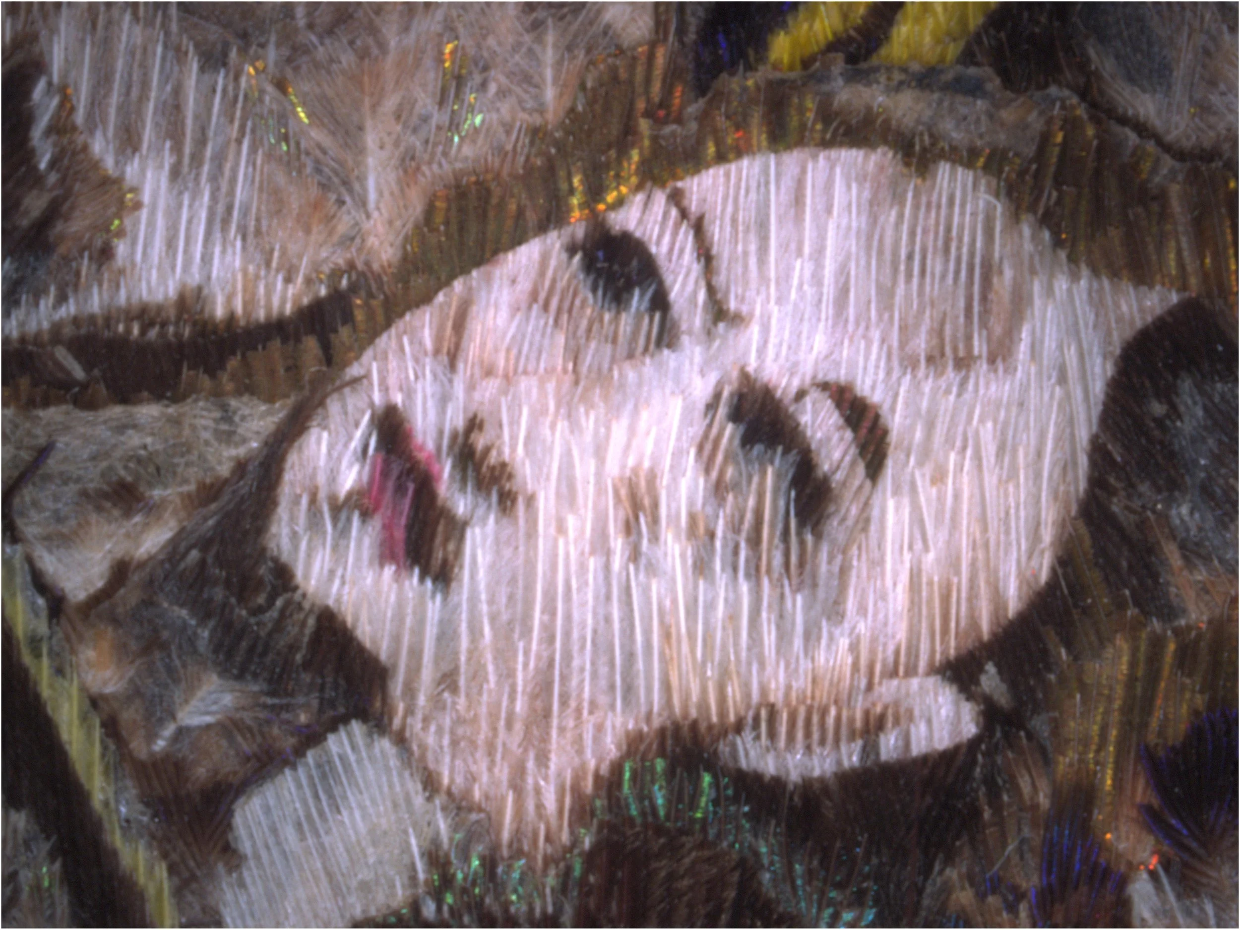 Bishop’s miter with feathered mosaic decoration. Fabric and paper support covered with small paper regions with adhered feathers. Detail at 25x magnification showing design constructed from black and white feathers. Museo dell Argenti, Florence. Image courtesy, Ellen Pearlstein.