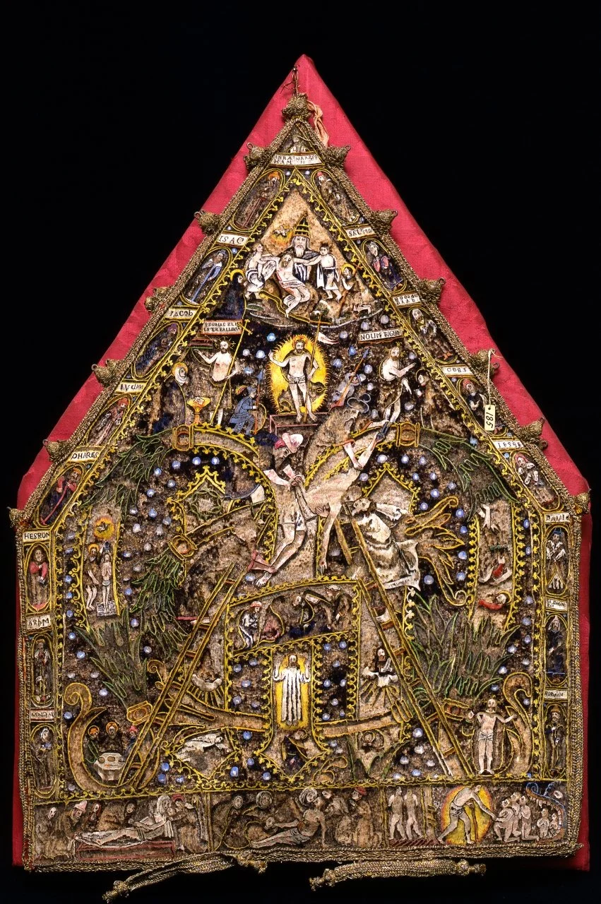 Mexican Manufactory (sec. xvi), Bishop’s miter with feathered mosaic decoration. Fabric and paper support covered with small paper regions with adhered feathers. 15 15/16" x 11 7/16". Museo degli Argenti, Florence, ase 185. Image courtesy, Yosi Pozeilov.