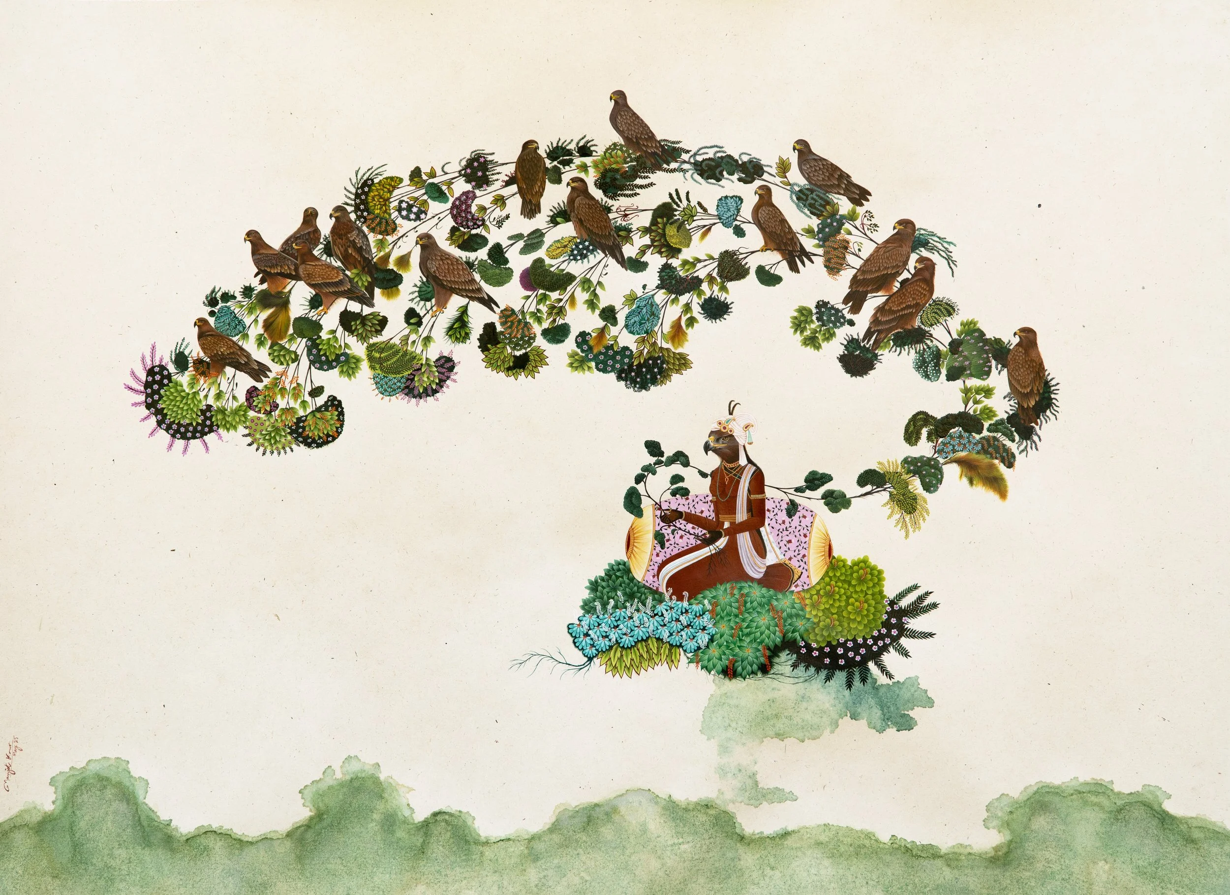 Manjot Kaur, The Convocation of Eagles, from the series Chthonic Beings, 2025. Gouache and watercolor on paper. 22 13/16 x 31 1/2 inches. Courtesy of the artist Manjot Kaur and mor charpentier.