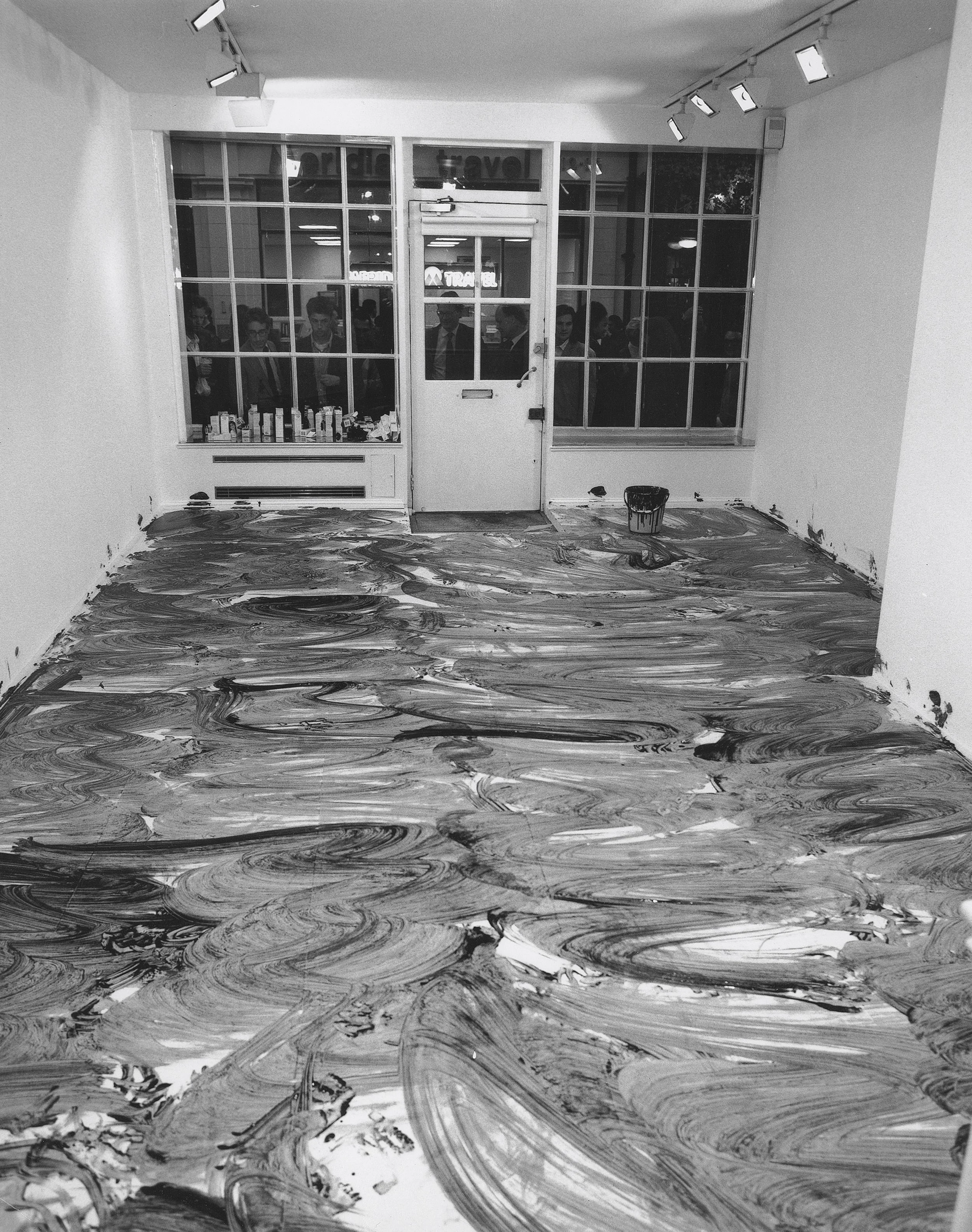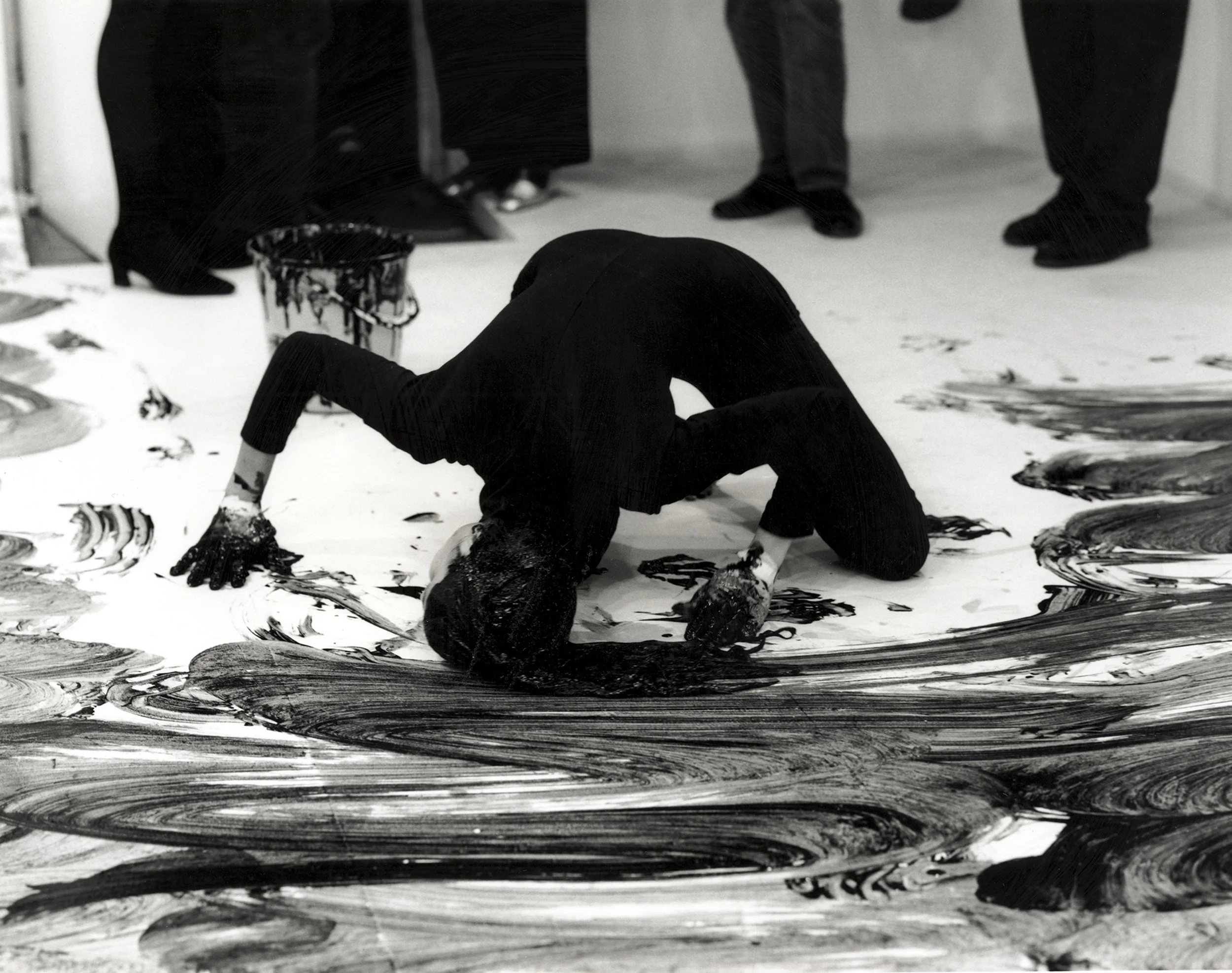 Antoni’s movements methodically propel her across the floor—sometimes she swings up an arm or extends a leg to indicate her path—slowly pushing her spectators out of the space. She shuffles her bucket throughout her performance to periodically re-saturate her head-brush. When she finishes her painting, she removes her gloves, flips her hair on top of her head, and leaves the room.