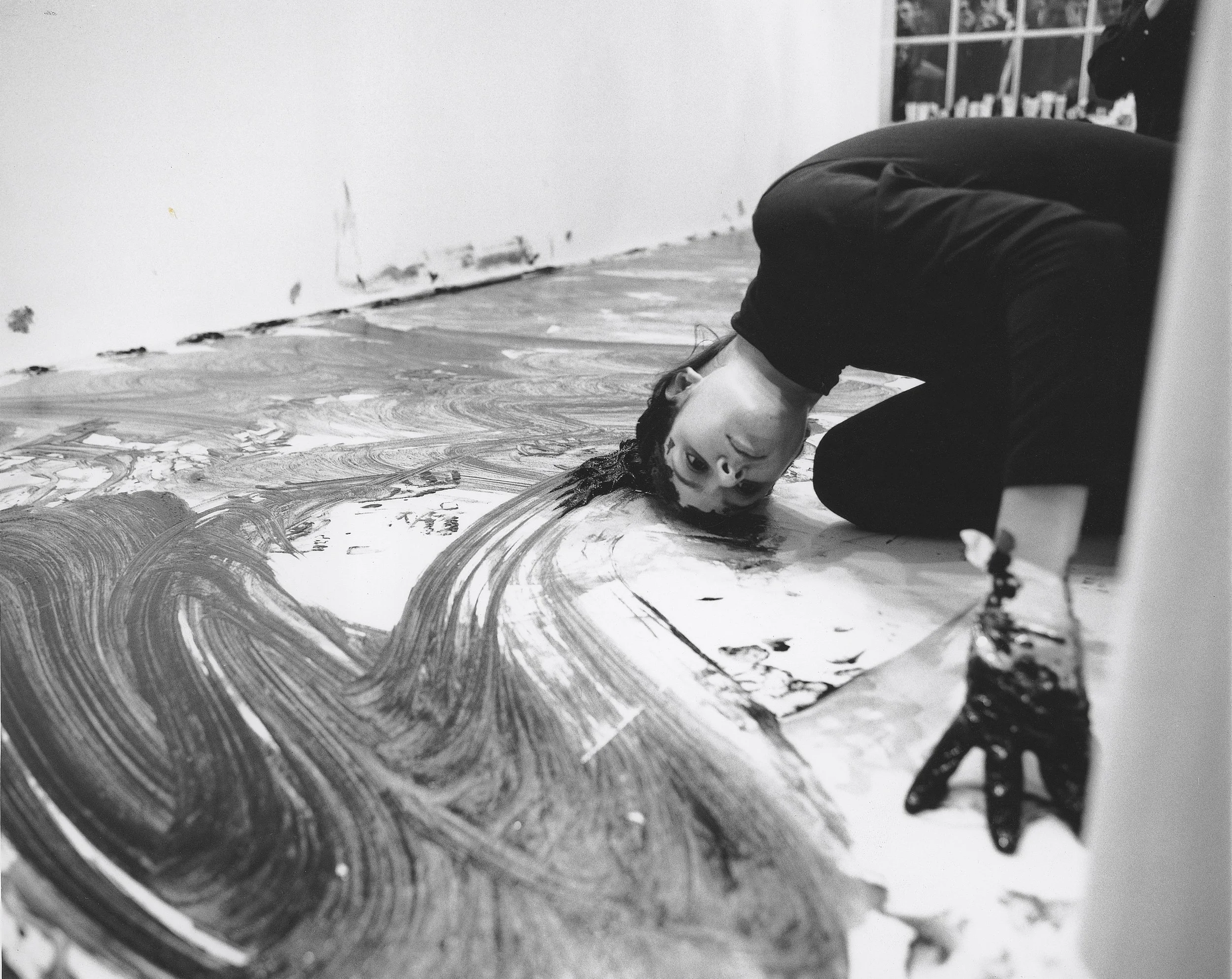 Antoni did not initially envision Loving Care as a live performance. She first showed images of “traces” painted with her head and hair dye in The Auto-Erotic Object, a 1992 group show at the Hunter College Gallery in New York City. In 1993 she enacted Loving Care in front of an audience at the Anthony d’Offay Gallery in London, England. One might ask, though: if her viewers are effectively chased out of the space, or otherwise craning to see—why was it important that they were there at all? To Antoni, those present were not passive observers but collaborators whose reactions, ranging from interest to disappointment, she can never totally anticipate. They’re “the wild card,” she has said.