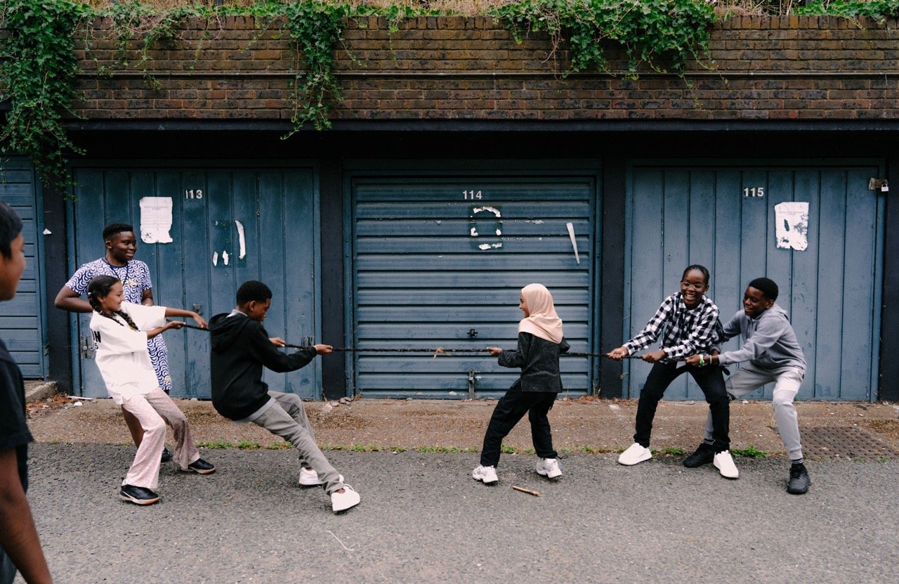 Angela Tozzi, [Young community members taking part in a ‘tug-ofwar’ with a rope made from 100% human hair, following a day of hairbased felt making in the R-Urban community garden during a HairCycle workshop], 2024. Photography credit: Angela Tozzi.