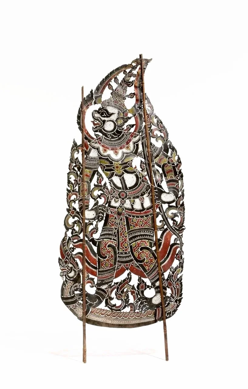 Shadow puppet of the monkey hero Hanuman in the guise of Ravana's heir; from the Thai version of the epic of Rama, 1850-1900, Thailand, Hide with pigments, bamboo, Asian Art Museum, 2006.27.115.1.