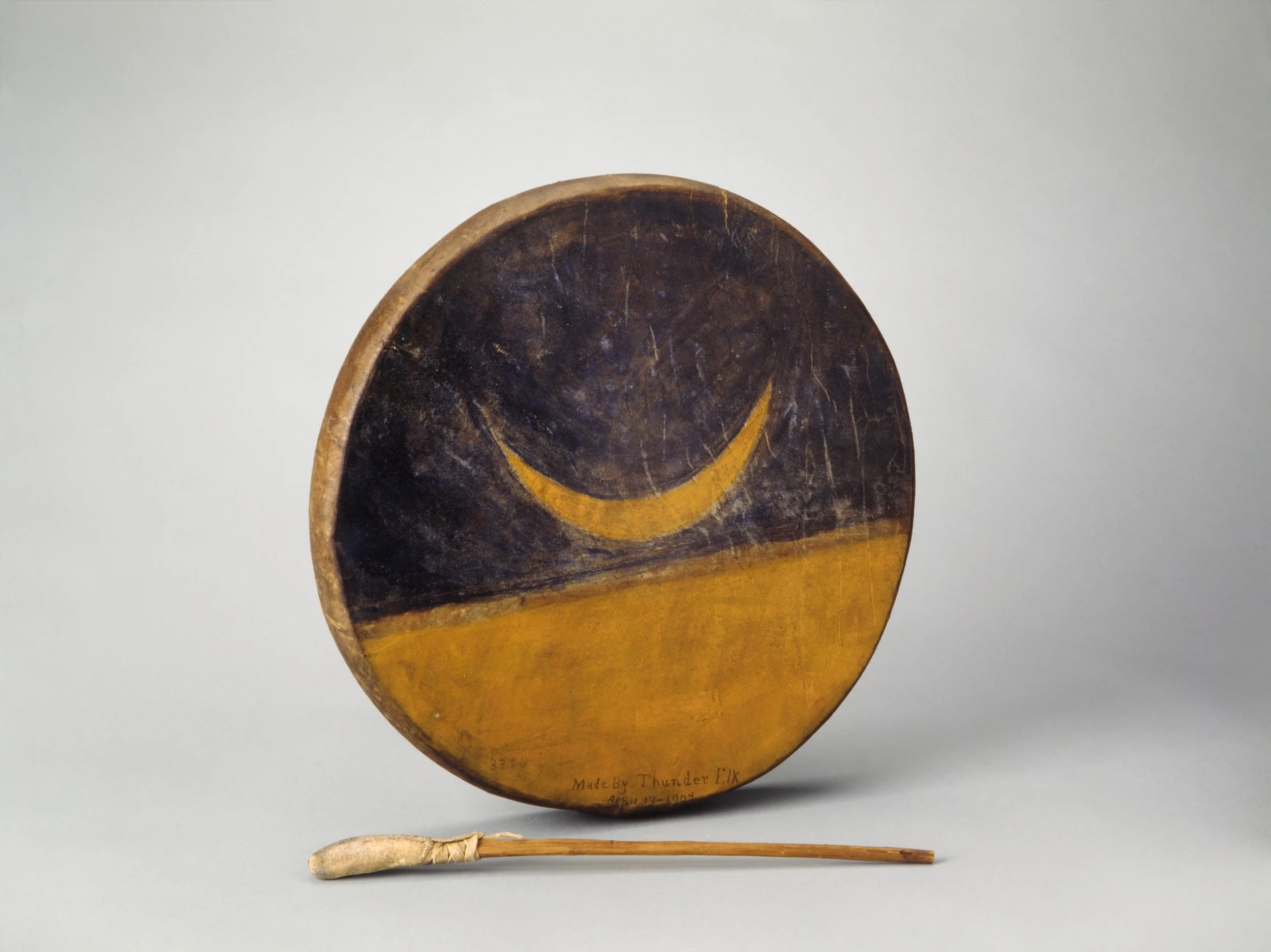 Thunder Elk (Sioux), Frame Drum, ca. 1887 (made), 1904 (painted), Dakotas, United States, Wood, leather, sinew (buffalo or deer); metal wire; pigment, Metropolitan Museum of Art, 89.4.3326a, b.
