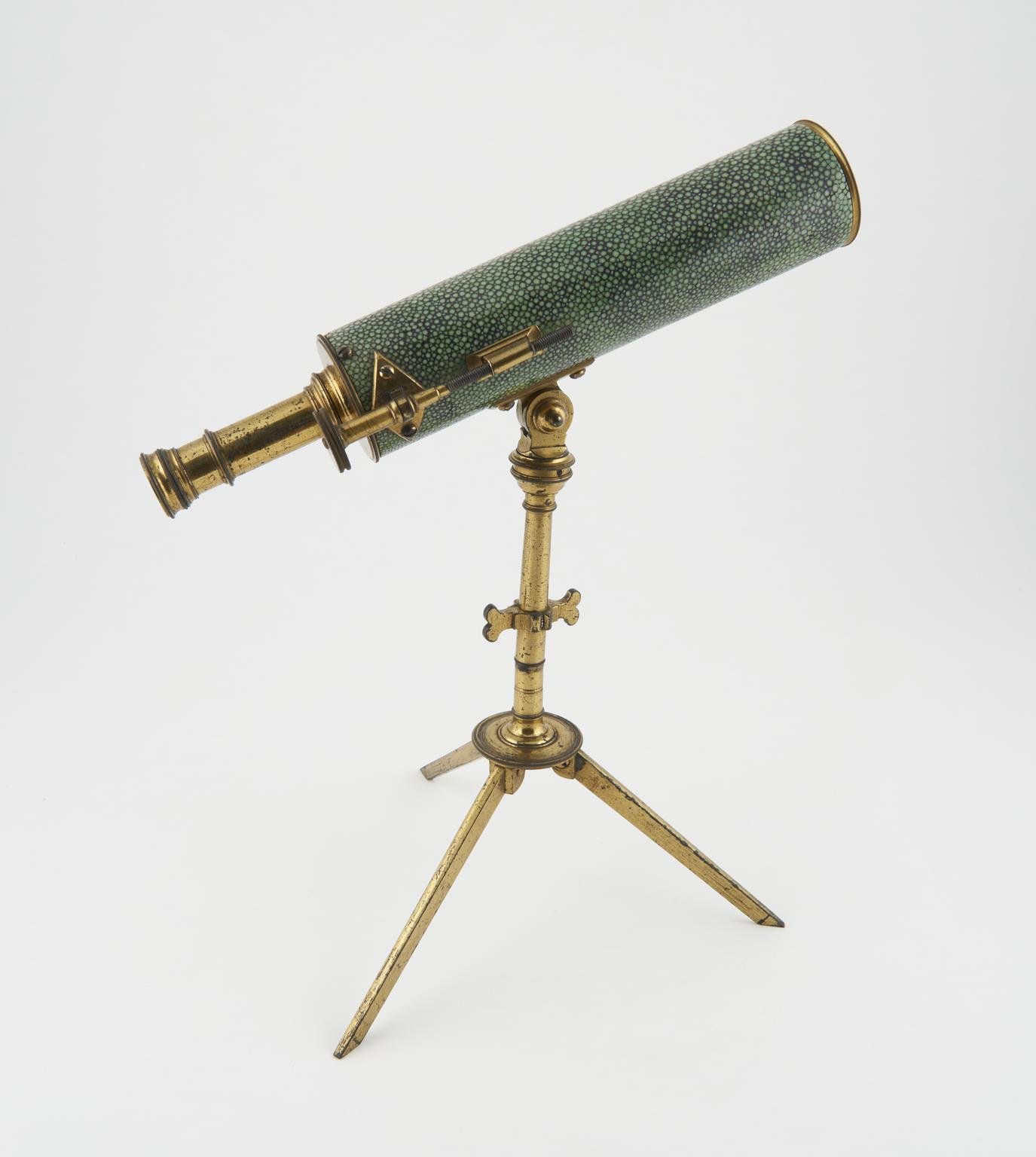 Jesse Ramsden (British, 1735–1800), Gregorian reflecting telescope, ca. 1790, London, England, brass tube covered with green shagreen on brass folding tripod, Science Museum Group Collection, 1925-139, © The Board of Trustees of the Science Museum.