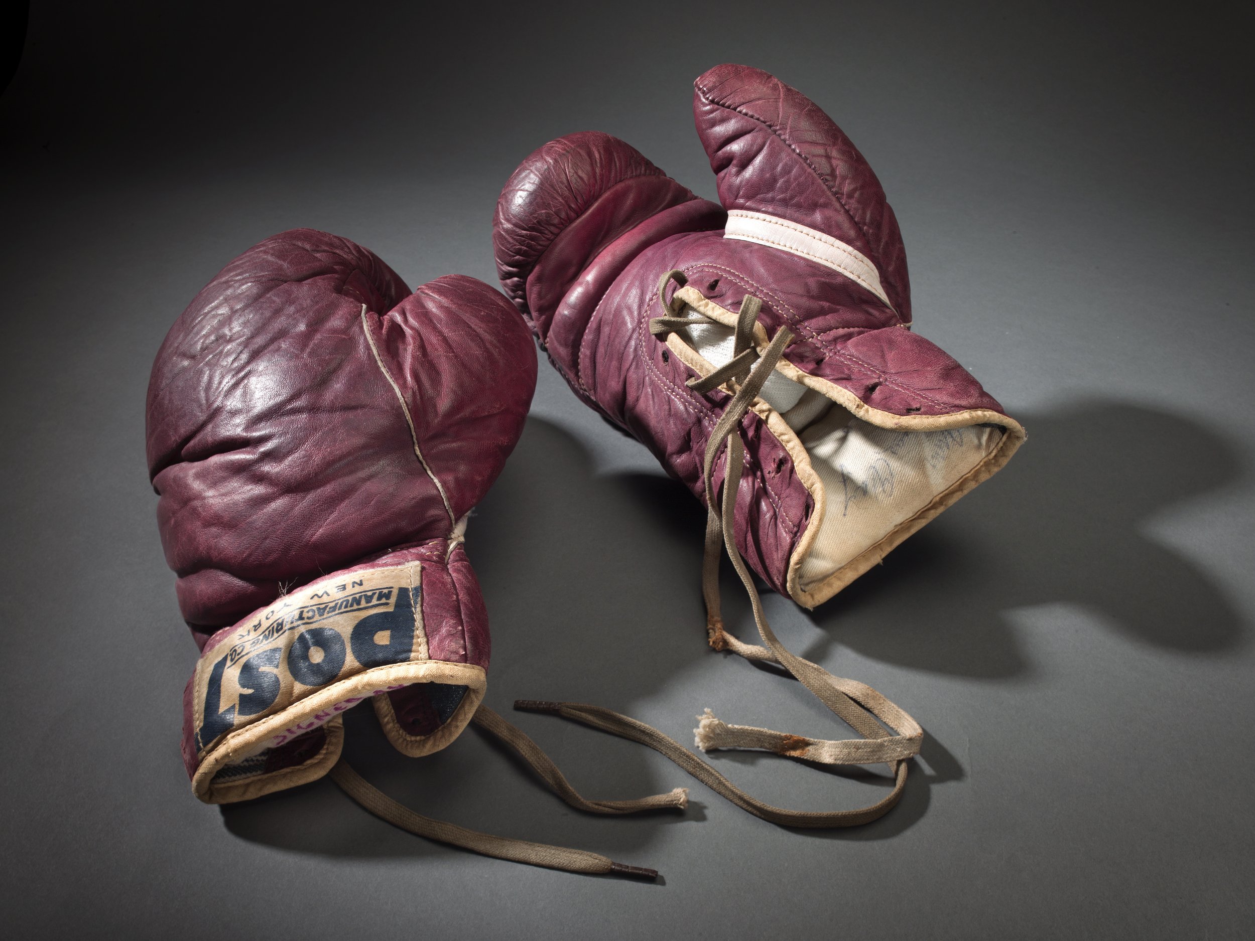 Training boxing gloves used and signed by Cassius Clay (Muhammad Ali), Post Manufacturing Co., 1960, New York, United States, Leather, cloth, thread, Collection of the Smithsonian National Museum of African American History and Culture, 2012.173.3ab.