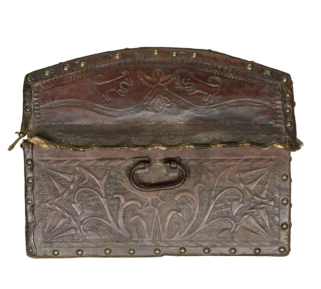 Trunk, ca. 1750, New York, New York, United States, Sweet or red gum with leather, nails, wrought iron hardware, and paper lining, The Chipstone Foundation, 1997.17, Photo credit: Gavin Ashworth.