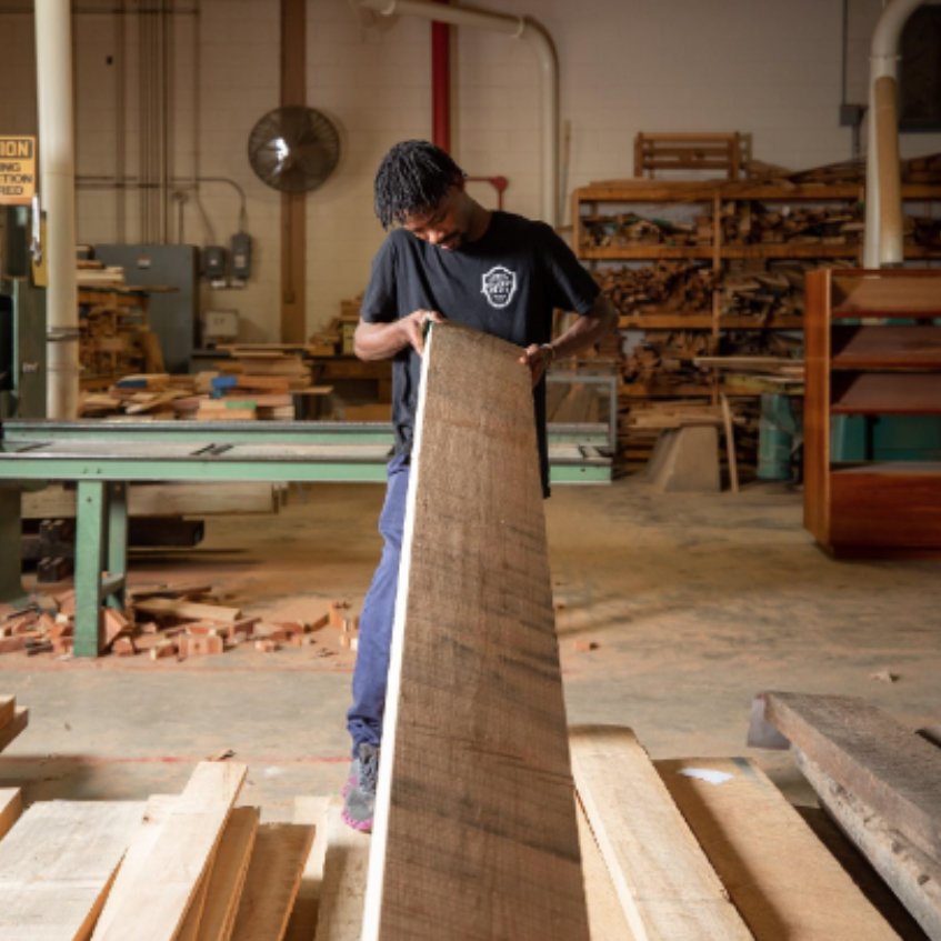 Woodcraft students like Joseph learn several key techniques making the Community Basket. Truing up the board is one of them. Secondarily, they learn to cut the average 12' board efficiently enough to yield 40 to 50 one-eighth inch by two inch wide bands, which produces three to four finished baskets per board. This is actually trickier than it sounds, as the student maker is also responsible for keeping the bands organized by grain orientation in the basket. The cut of the lumber changes from quarter sawn to rift sawn to plain or flat sawn, causing the grain of the basket to change as well. The six outer bands need to be cut from the same board, as do the six inner bands. This subtlety is not lost on the Berea students, as the stained color and grain patterning can vary widely. Understanding how to see and match up the grain is a big part of making a successful basket.