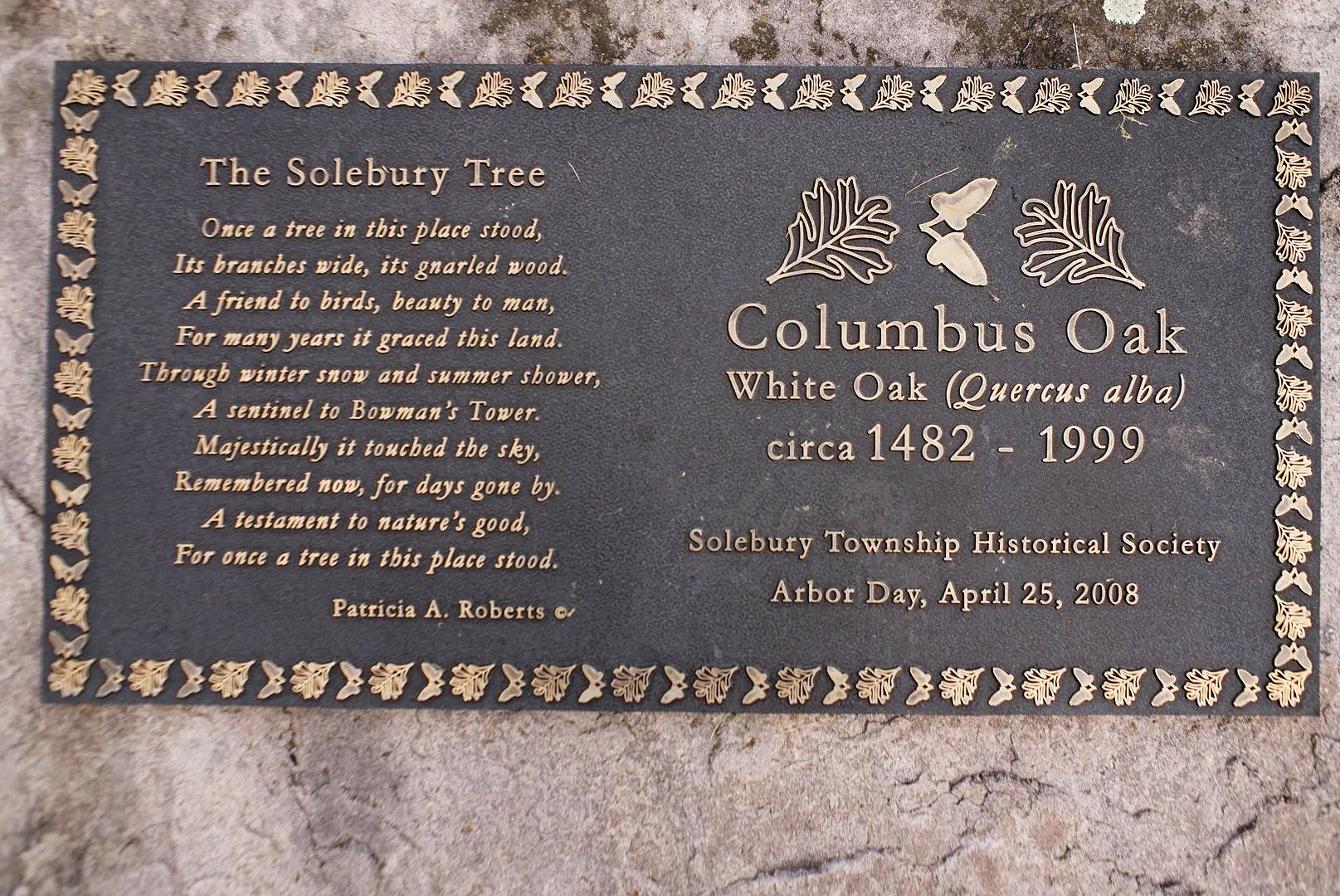 Before the oak is a massive stone, a 2½ ton Solebury sandstone monument that marks the site of the mother tree, the Columbus Oak. But there is no sign, no marker, nothing that reminds us of the remarkable young woman that this tree memorializes.