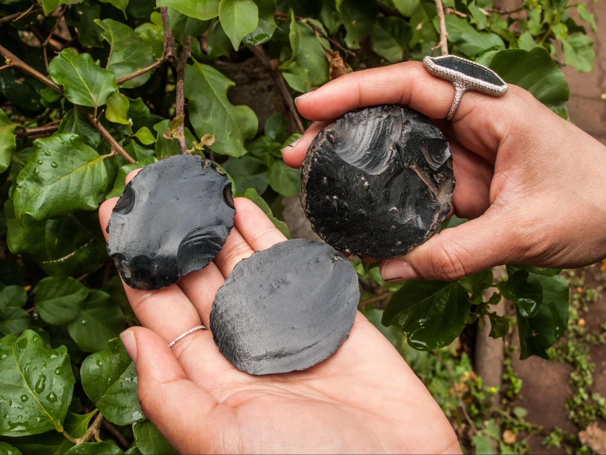 Monique Péan holding ancient obsidian on Easter Island, 2016. Courtesy of Monique Péan and Michael Morrison.