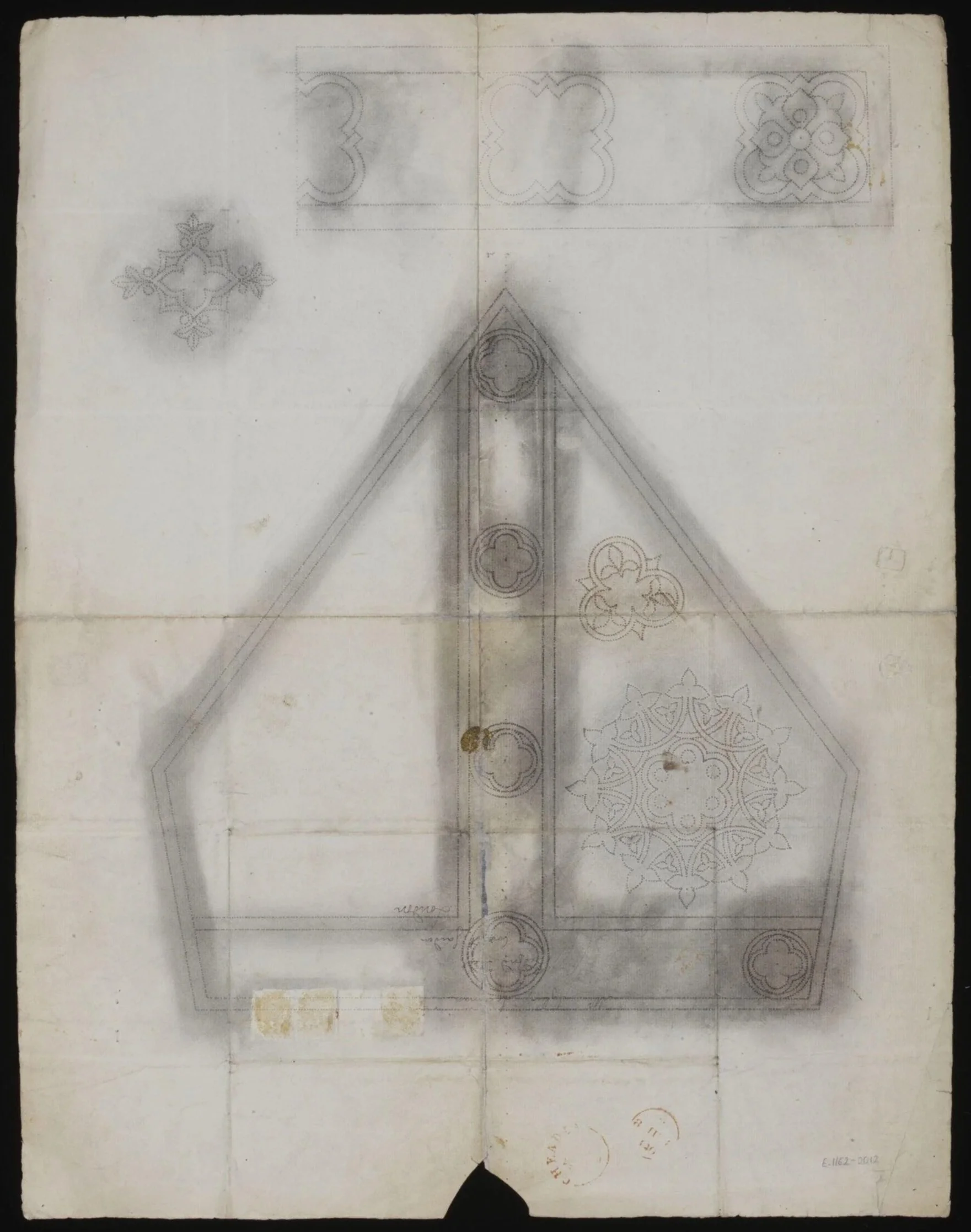A.W.N. Pugin (designer). Eclesiastical design, 19th century-20th century. Pen and ink and watercolor on laid paper. 22 1/4 x 17 1/4 in. Given by the Community of St. John Baptist, E.1162-2012. © Victoria and Albert Museum, London. [back and front]