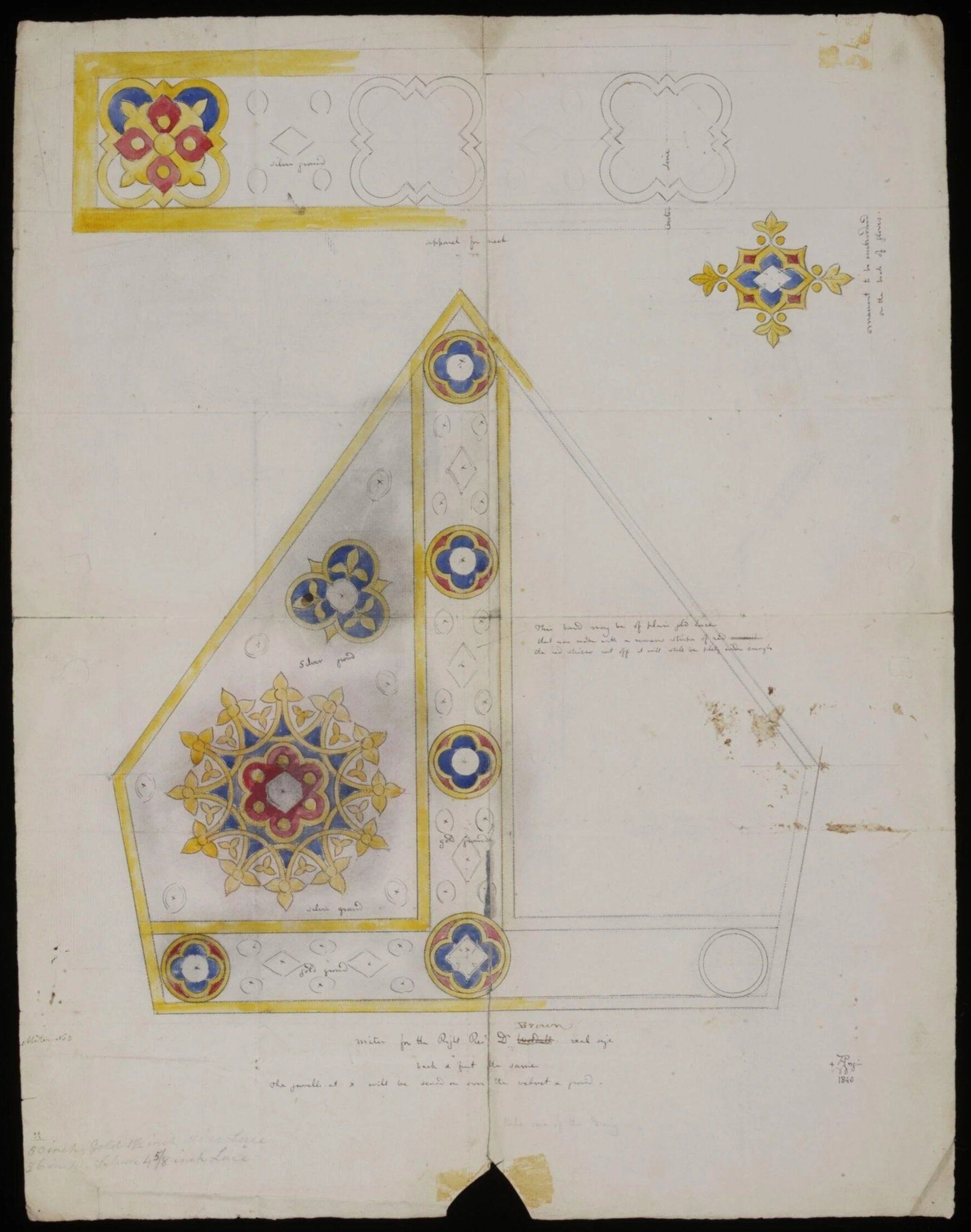 Charcoal pouncing was also used by professional embroiderers, whose work experienced a boom in nineteenth-century Britain, stimulated by increasing demand for ecclesiastical vestments and furnishings. A partially colored design for a bishop’s miter by the Gothic Revival architect-designer A.W.N. Pugin, from 1840, is a good example of a drawing acting as a hard-working, communicative object, a paper emissary between designer and maker. The sheet bears notes in various hands, including the command 'take care of this dra[w]ing,' a clear indication of its importance in the design process. Prominent prick marks and the dark shadow of charcoal pounce show that Pugin’s design was transferred to fabric on a 1:1 scale – already precisely measured to fit a bishop’s head.