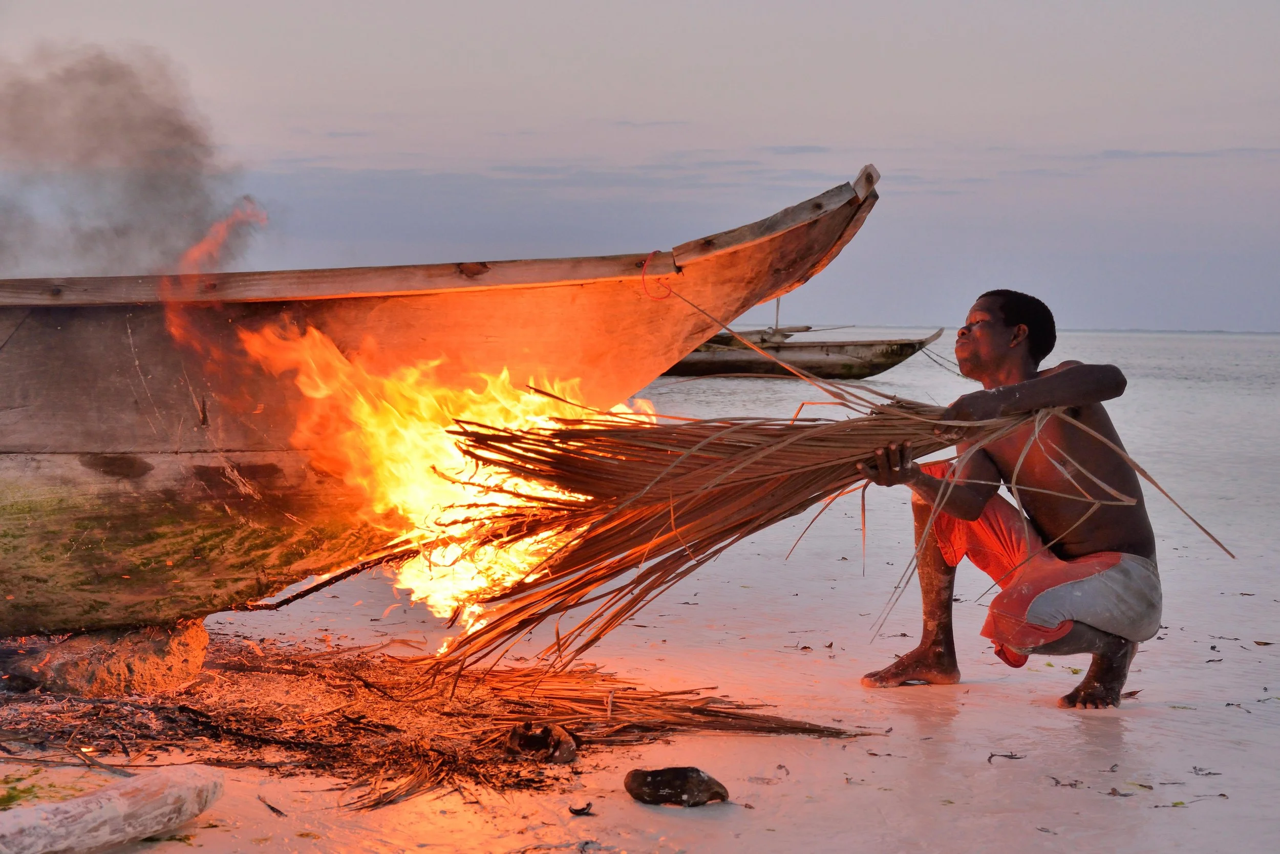Fabian von Poser, Fisherman smoking his boat with burning palm fronds, to harden the surface and to remove vermin, Dongwe Beach, Dongwe, Zanzibar, 2013. imageBROKER / Alamy.