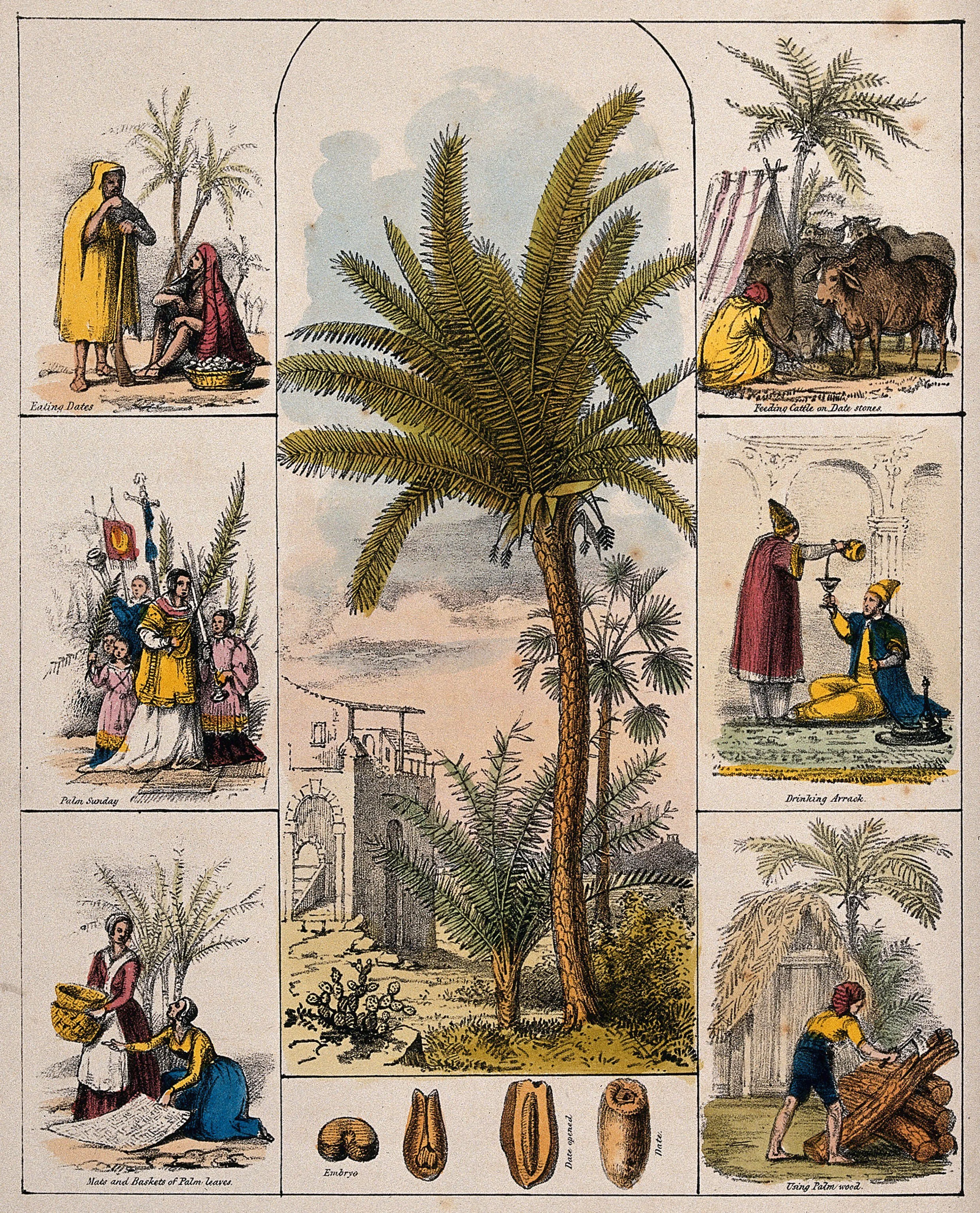 A date palm tree (Phoenix dactylifera) and segments of the fruit bordered by six scenes illustrating its use by man. Coloured lithograph, c. 1840. Wellcome Collection. Source: Wellcome Collection.