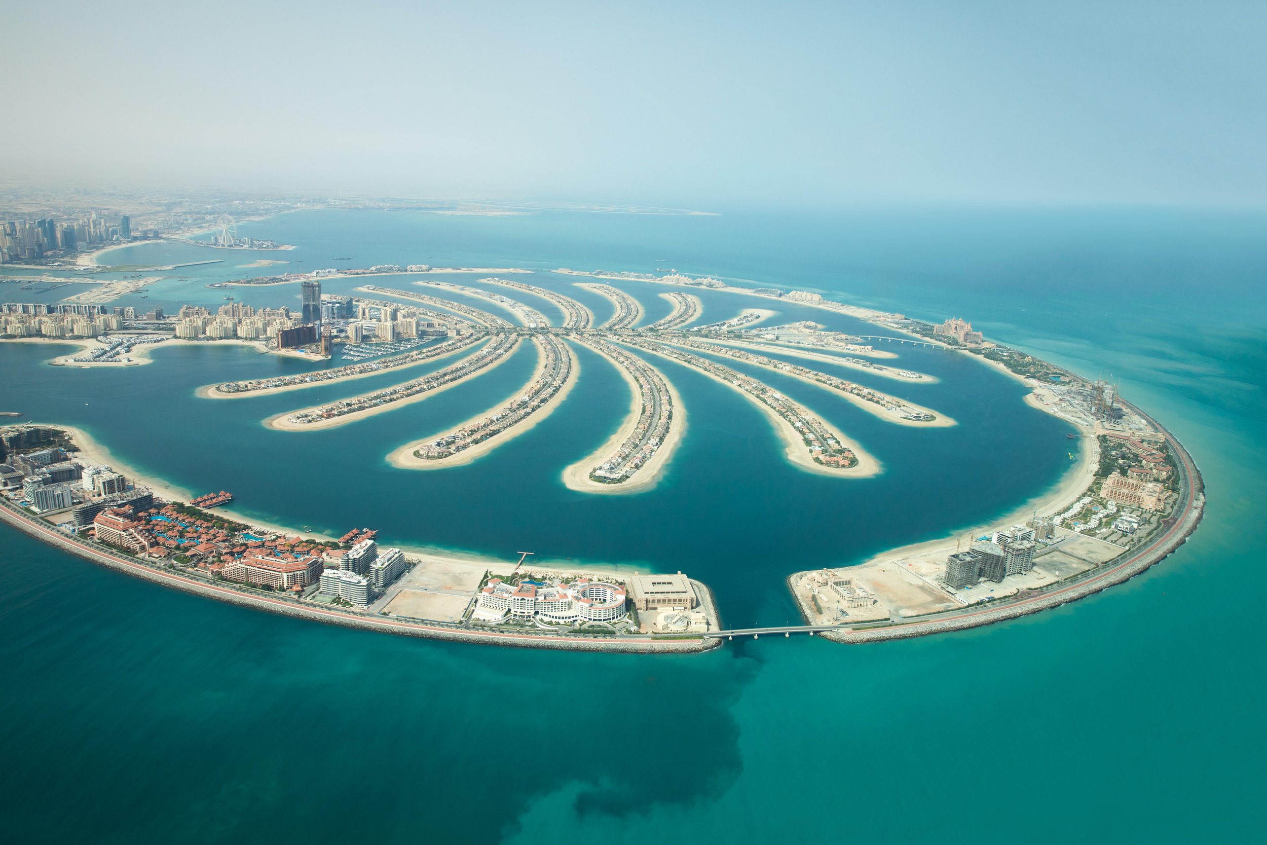 Aerial view of Palm Jumeirah man made island and Dubai Marina and JBR district on a sunny day. Dubai, UAE, 2018. Kertu Saarits / Alamy.