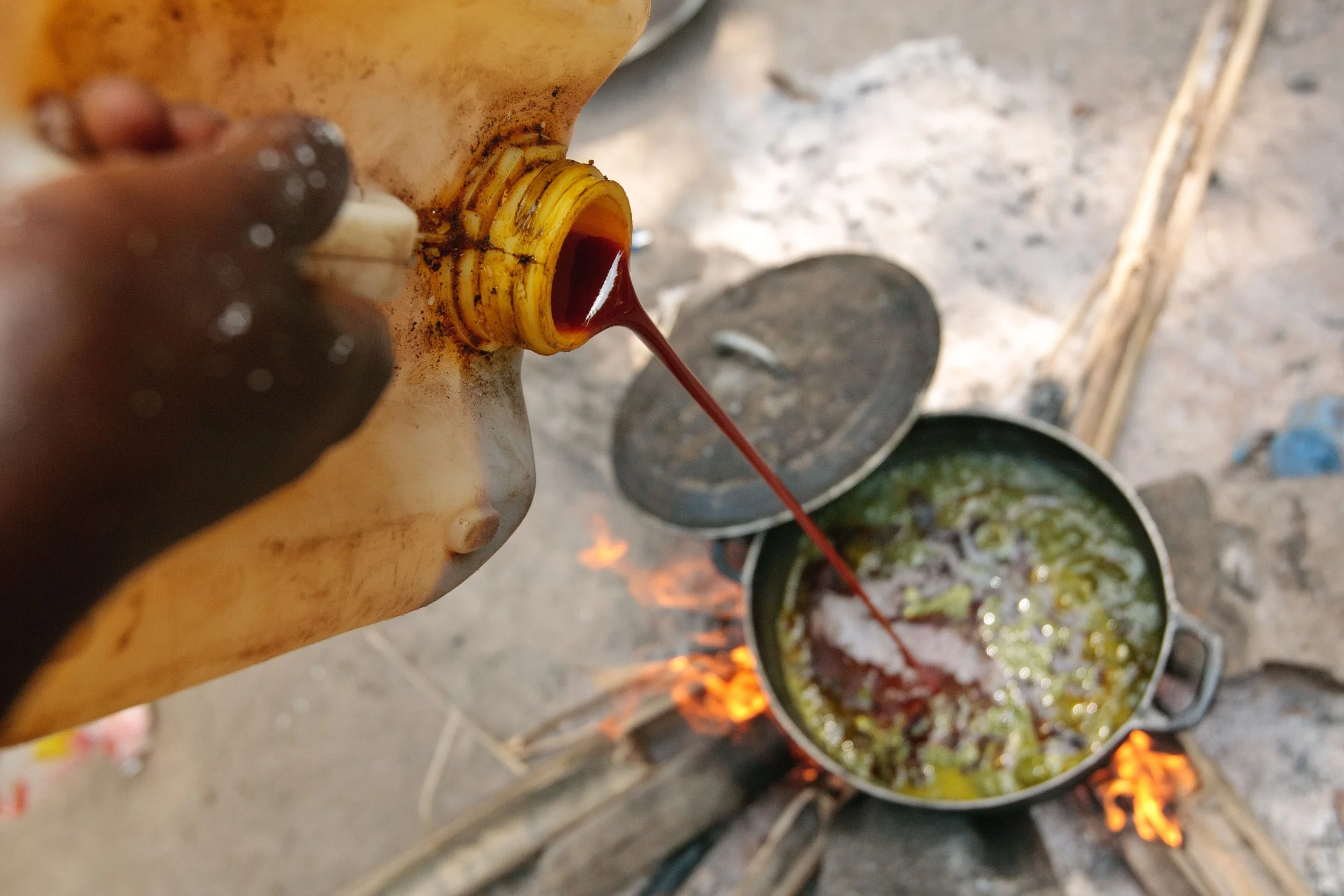 Edith Saysay, 35, pours palm oil into a pot as she cooks in the village of Jenneh, Bomi county, Liberia, 2012. Olivier Asselin / Alamy.