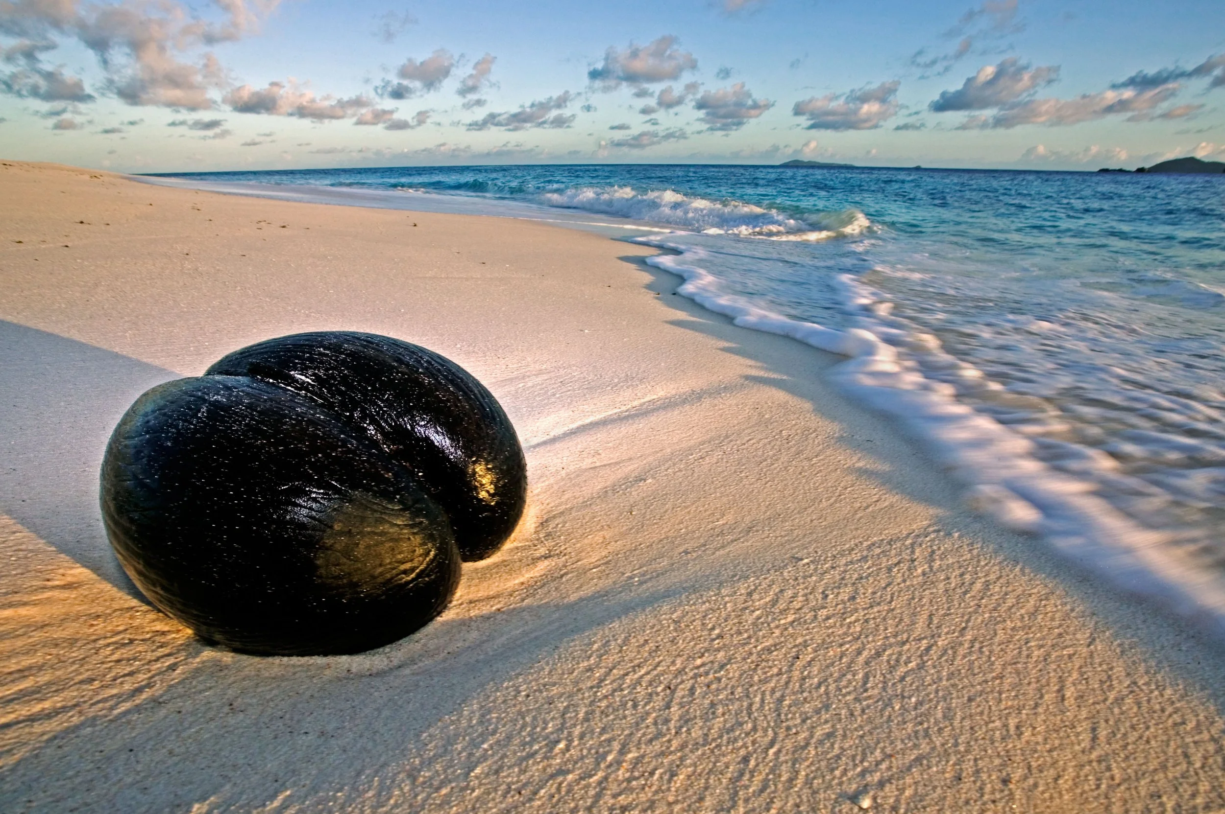 Coco de mer palm seed Lodoicea maldivica Seed washed up on beach Worlds heaviest seed Vulnerable Seychelles, 2004. Martin Harvey / Alamy.