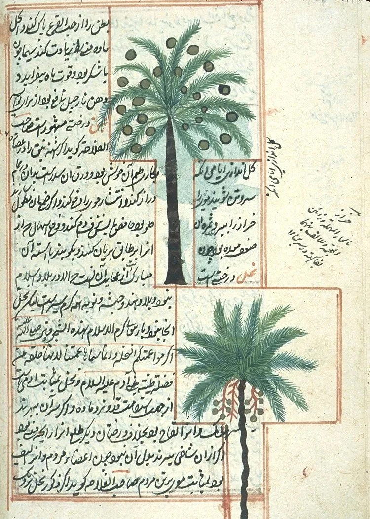 by Zakarīyā’ ibn Muḥammad al-Qazwīnī, ‘Ajā’ib al-makhlūqāt wa-gharā’ib al-mawjūdāt (Marvels of Things Created and Miraculous Aspects of Things Existing), [Two types of palm trees], 1283/682; copy was made in 1537/944. MS P 1, fol. 168b. Islamic Medical Medical Manuscripts at the National Library of Medicine, Courtesy of the National Library of Medicine, Bethesda, MD.