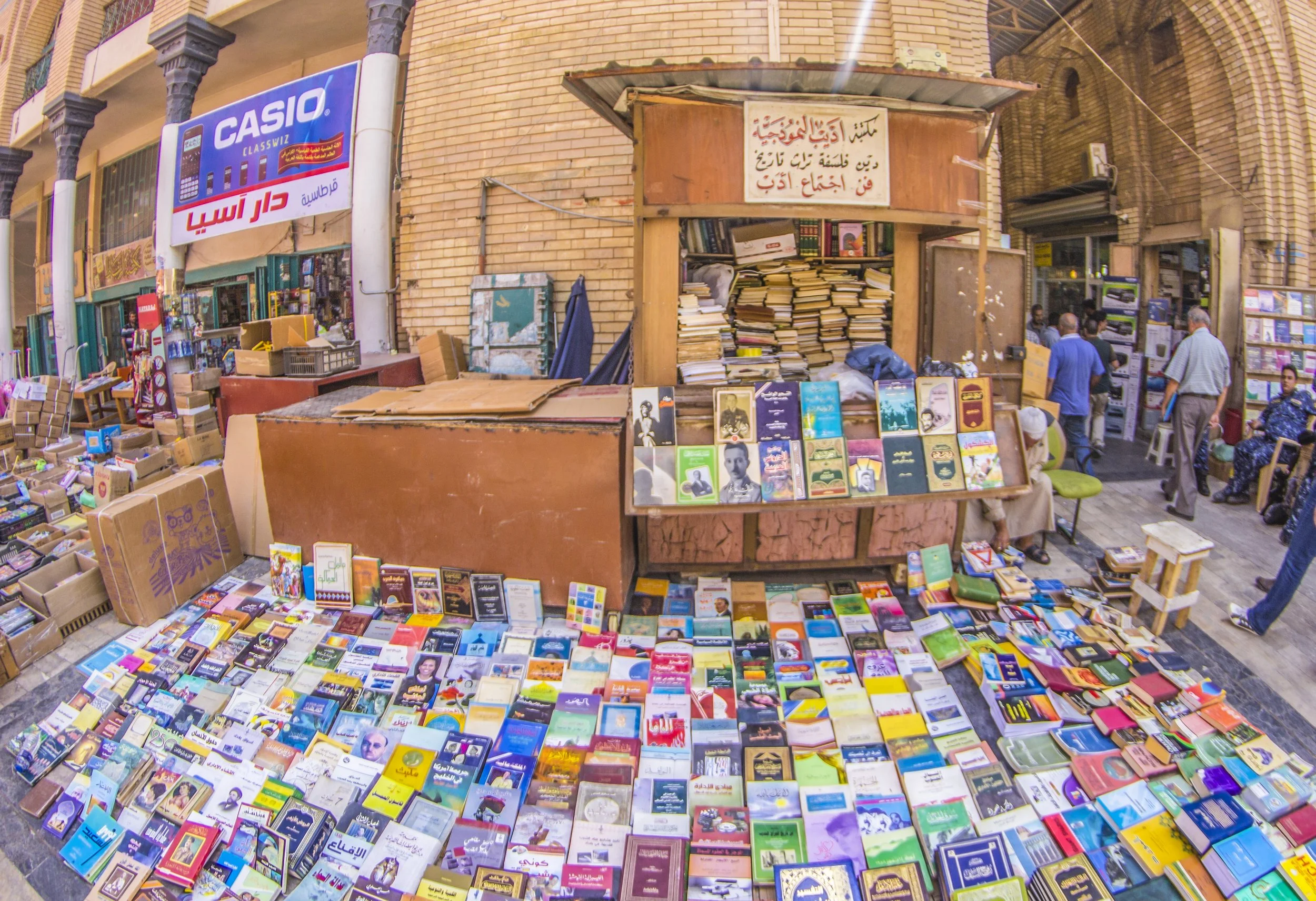 A typical scene of books on display at bookshops on Al-Mutanabbī Street in Baghdad, 2015.