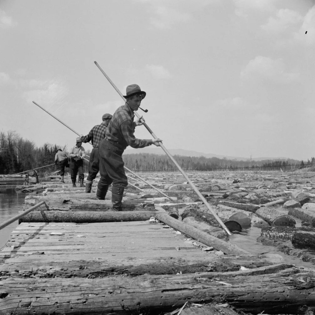 John Collier Jr. (American, 1913–1992), Spring pulpwood drive on the Brown Company timber holdings in Maine. Pikemen keep the logs moving down toward the sluiceway of the power dam, Nitrate negative, May 1943, Library of Congress, LC-USW3- 030115-E [P&P] LOT 761.