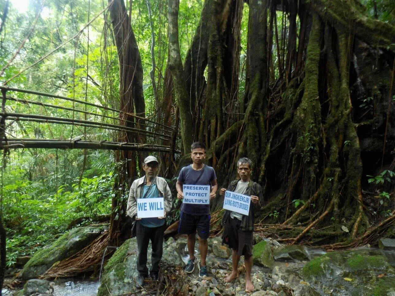 Morningstar Khongthaw (in the middle) with his friends, standing in the backdrop of a 200 to 300-year-old Jri Bamon, to campaign for the ‘preservation,’ ‘protection’ and ‘multiplication’ of living root bridges. Photo, Morningstar Khongthaw.