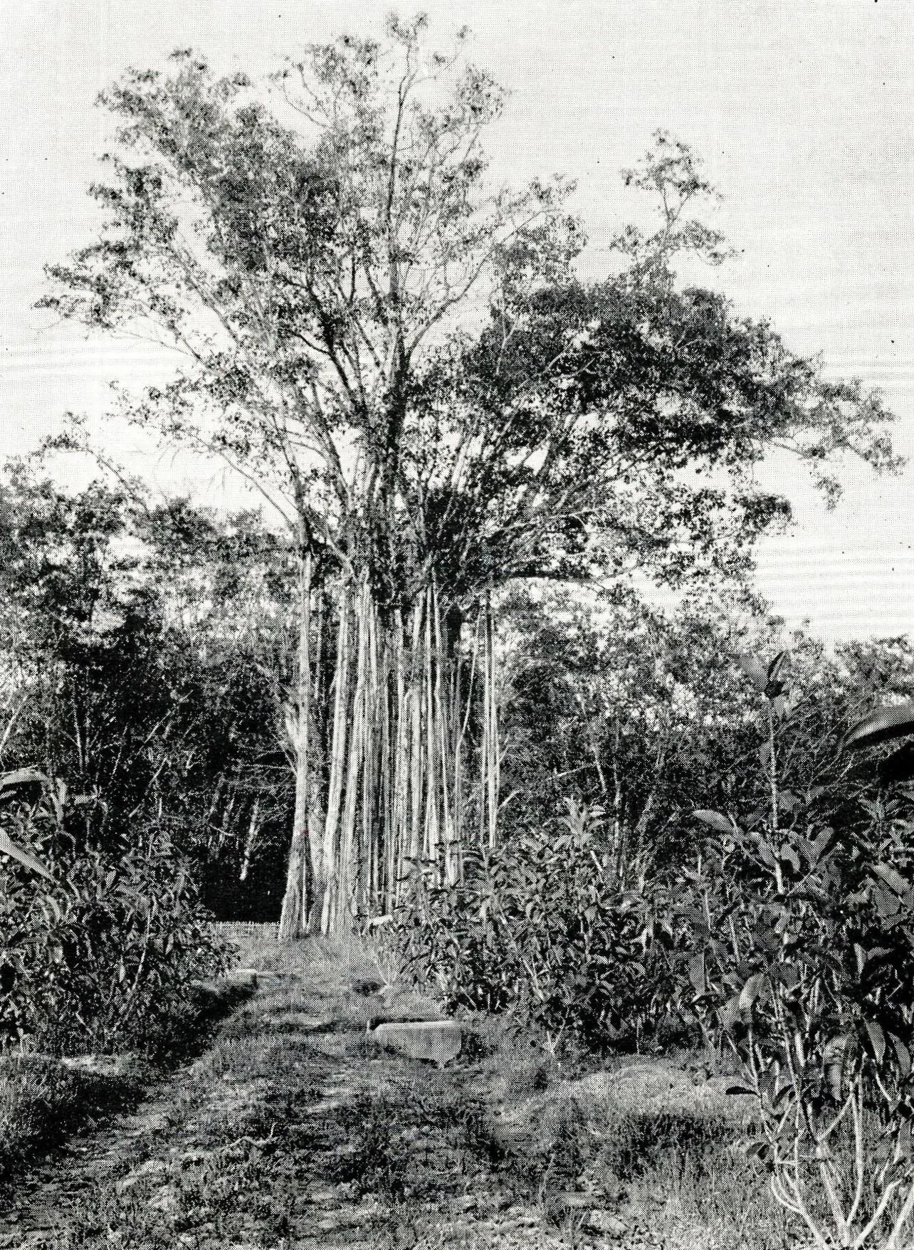 A wild Ficus elastica tree about of 120 feet high. Photo, Ficus Elastica: Its Natural Growth and Artificial Propagation, 1906, E. M. Coventry.