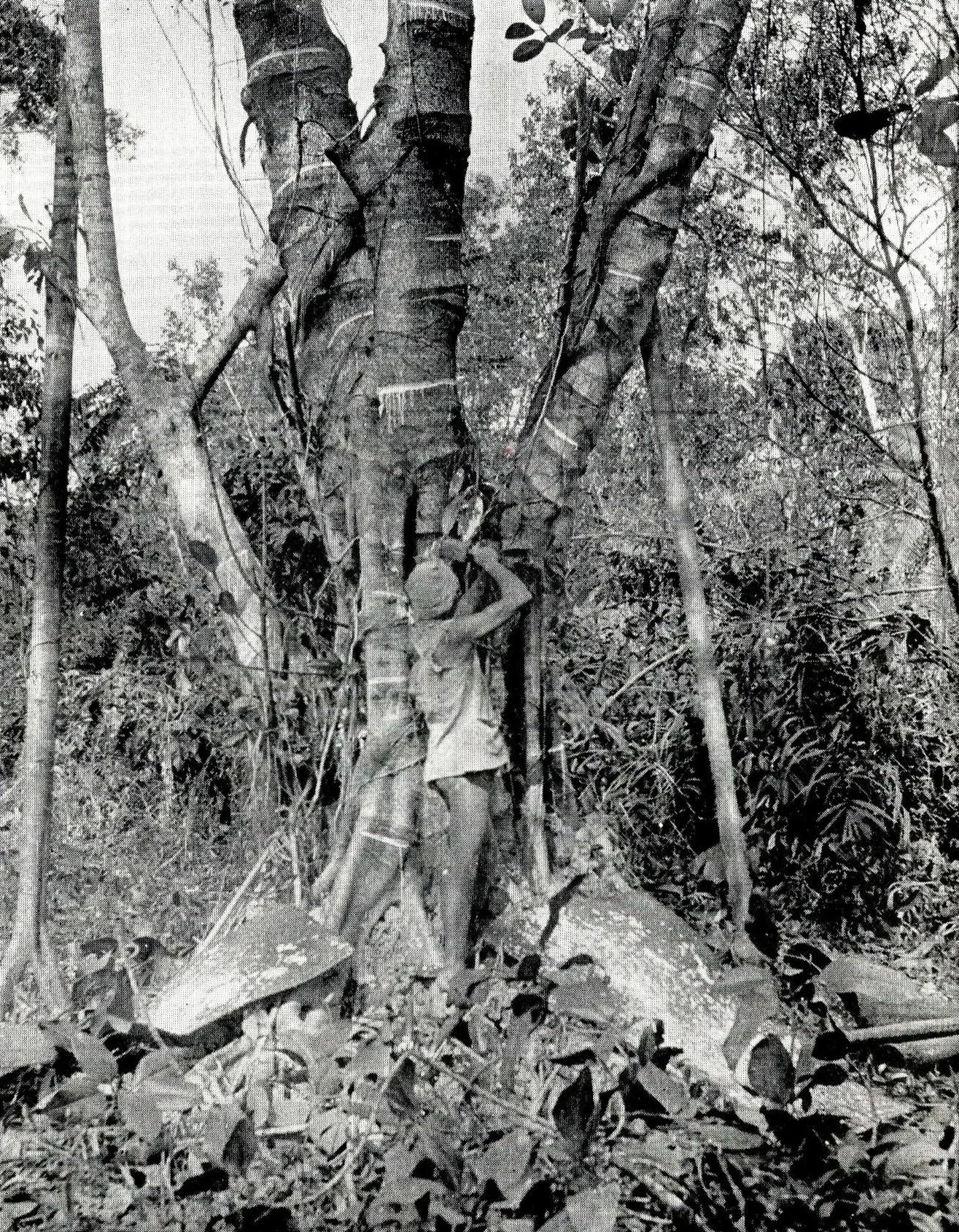 An indigenous rubber tapper collecting latex from a wild Ficus elastica in colonial Assam. Photo, Ficus Elastica: Its Natural Growth and Artificial Propagation, 1906, E. M. Coventry.