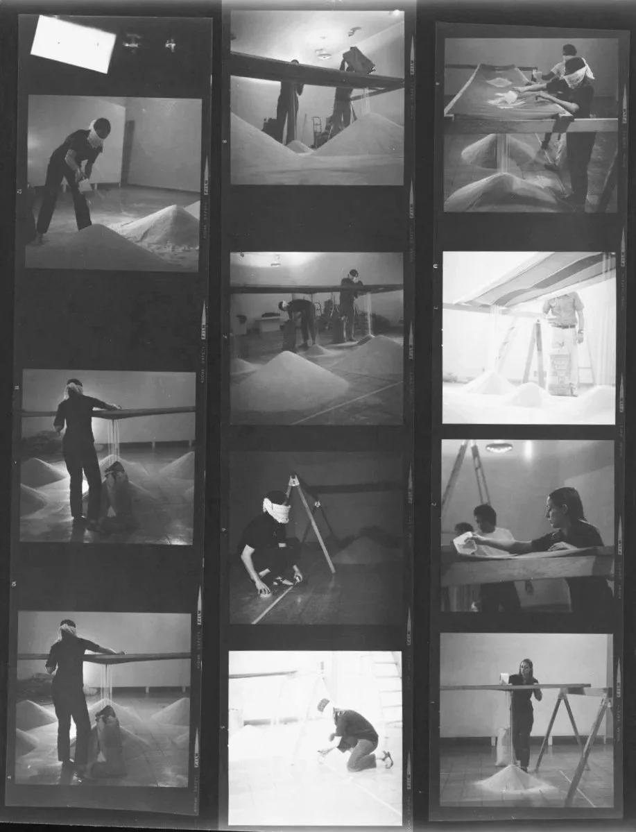 Connie Zehr (American, 1938– ) and assistants constructing Zehr’s installation Fallen Sand at Mount San Antonio College, Walnut, California, 1970. Contact sheet. Photographer unknown. Connie Zehr papers, 1960–2020, Archives of American Art, Smithsonian Institution.