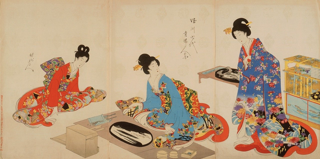 Toyohara (Yōshū) Chikanobu (Japanese, 1838–1912), Women’s Activities of the Tokugawa Era: Creating Bonkei Tray Landscapes, 1896. Woodblock print. 14.75 x 29.06 in. (37.0 x 73.8 cm). Los Angeles County Museum of Art, ac1998.235.1.1-.3.
