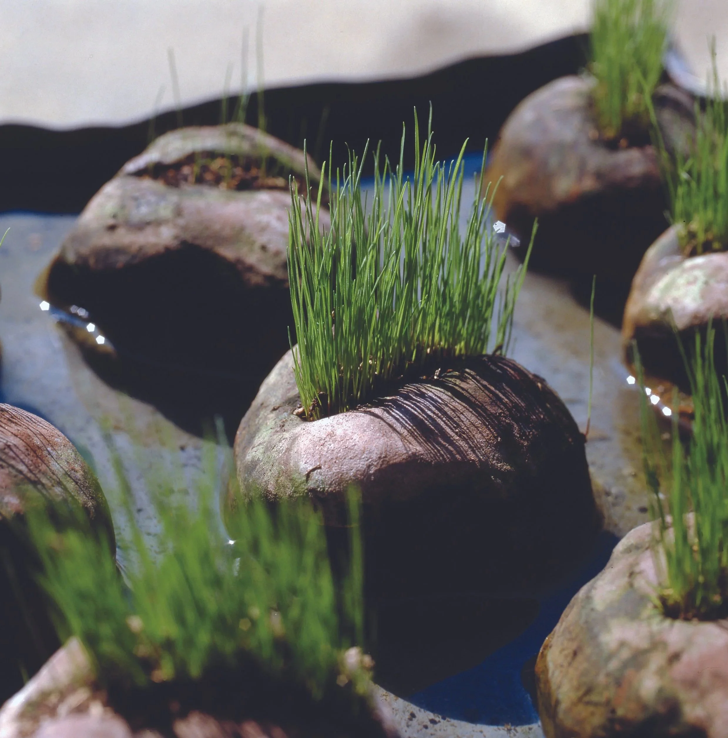 Cesario Carena, “Capillarità” (Capillarity), 2018. Simple shapes needle forms, pistils and spheres —are submerged in water, which slowly rises until it activates the germination of the sown humus. The result is a range of aesthetic ideas that take advantage of the natural properties of terra cotta. Photo courtesy of Paolo Robino.