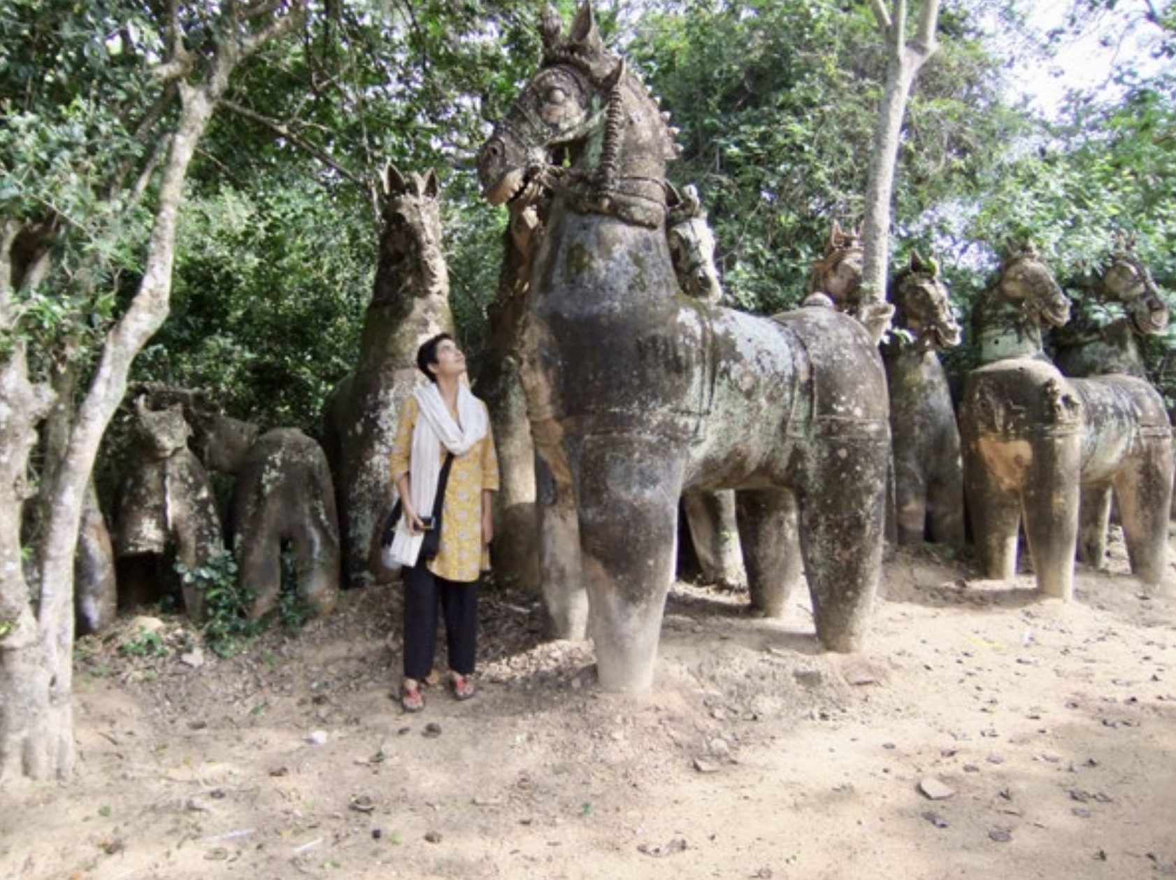 Terra cotta horses in Urpetti, Ashwini Bhat (author) for scale. Photo by Jane Perryman.
