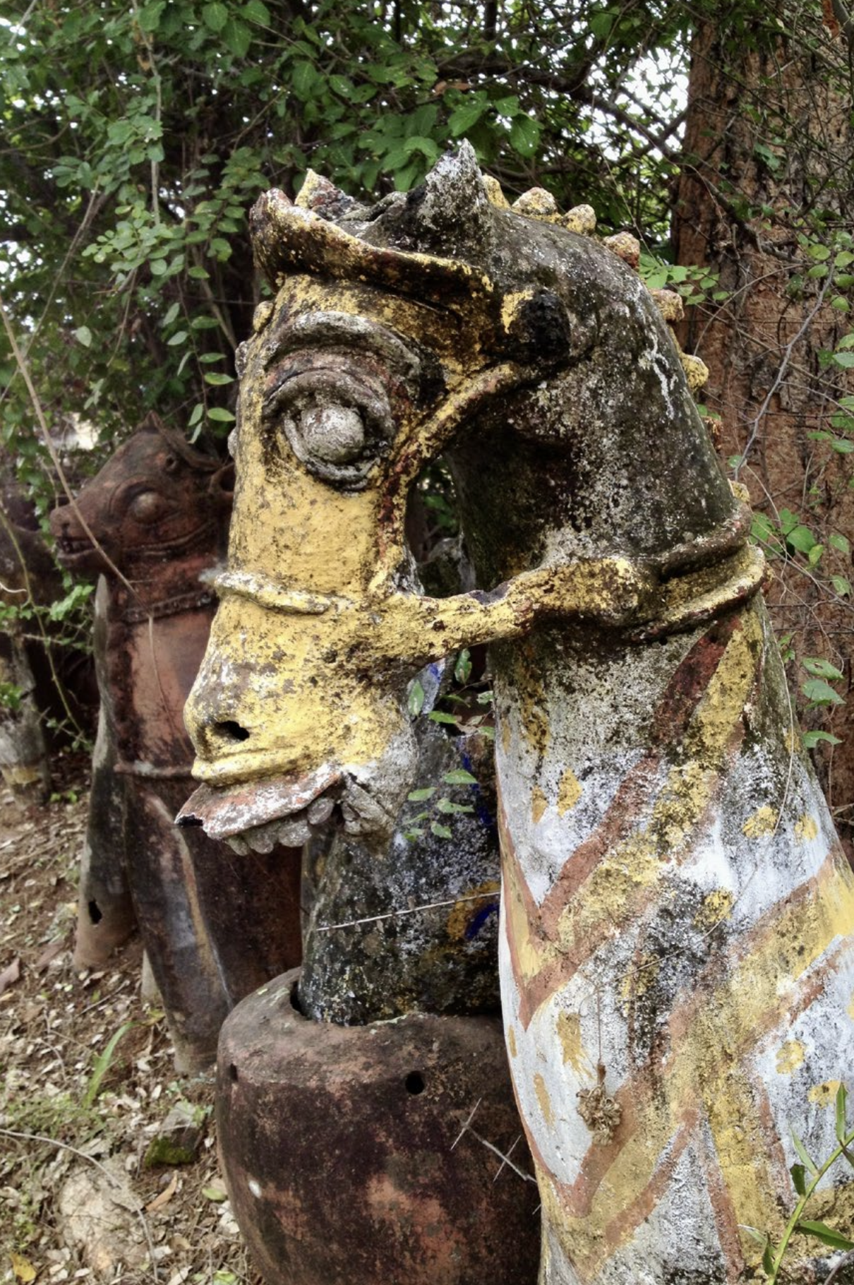 Today, almost fifteen years after I first saw the horses, I find myself living 8,000 miles away from Pudukottai, in California. But I remember the entrance to Urpetti, a small temple in Pudukottai, like it was yesterday. Unlike a typical Hindu temple, it stands in a thickly forested patch of land next to a large pond with pink lilies. A cow herd grazes in the distance. On either side of a dirt path leading to the temple are the horses, standing in action poses. Some have been here so long that they are half-buried in the ground. Others lean their heads on one another, or against a tree. A few of the heads have fallen to the ground, leaving cylindrical hollow necks, out of which vegetation grows. Some horses seem to snarl and show off their teeth, but you can gaze into their eyes and gently touch the moss growing on their foreheads. Their beauty is otherworldly, yet one is also aware that they are tangible artifacts, as complex as the country itself.